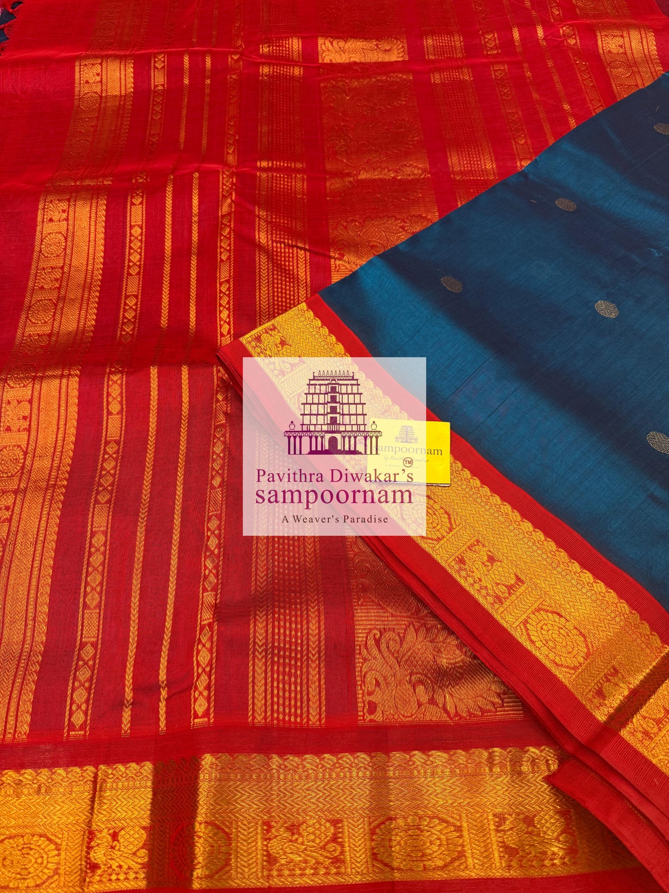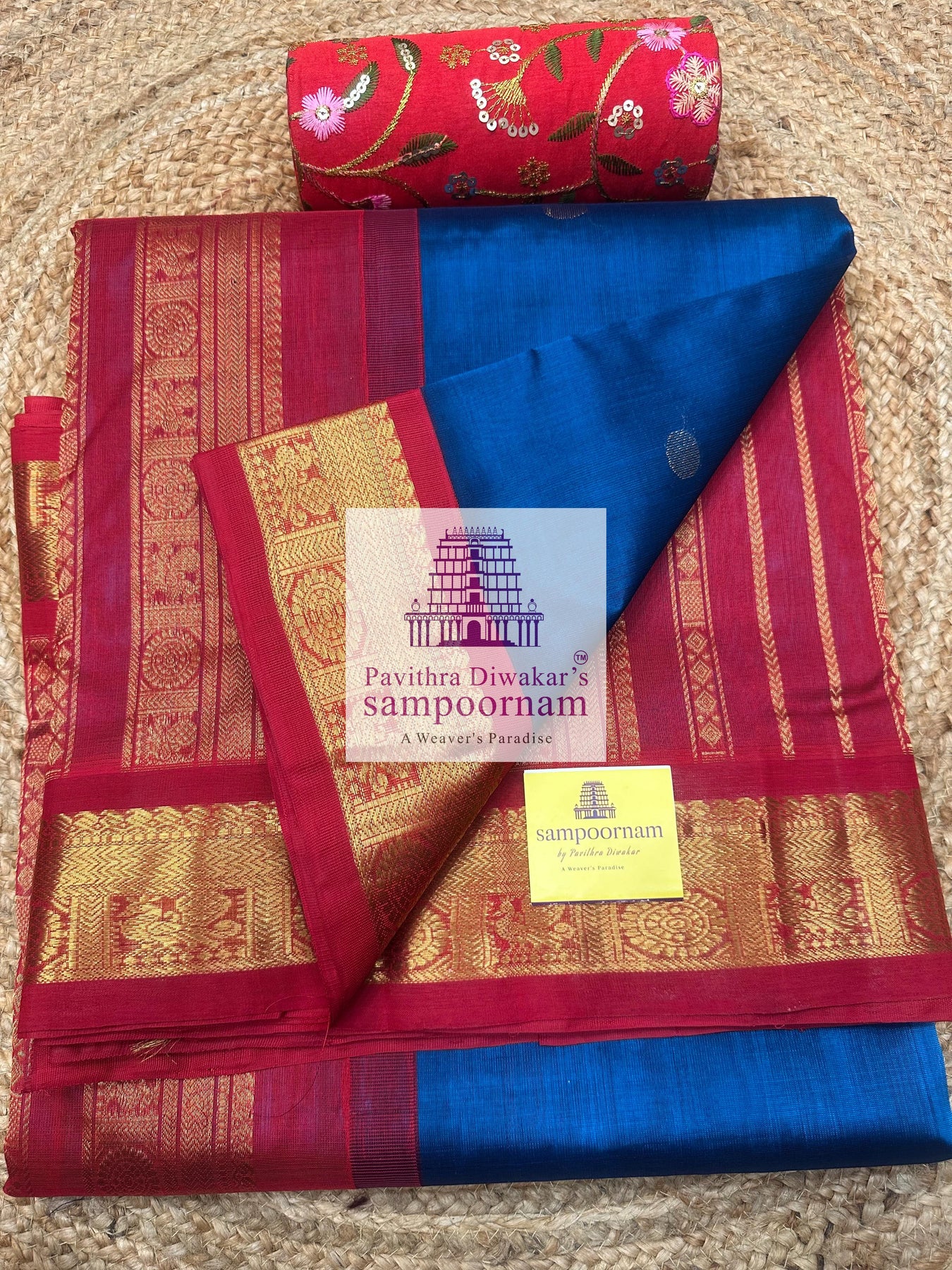 Blue with Red , Zari butta in the body , traditional borders and rich pallu ,Ten Yards Korvai Silk Cotton Saree