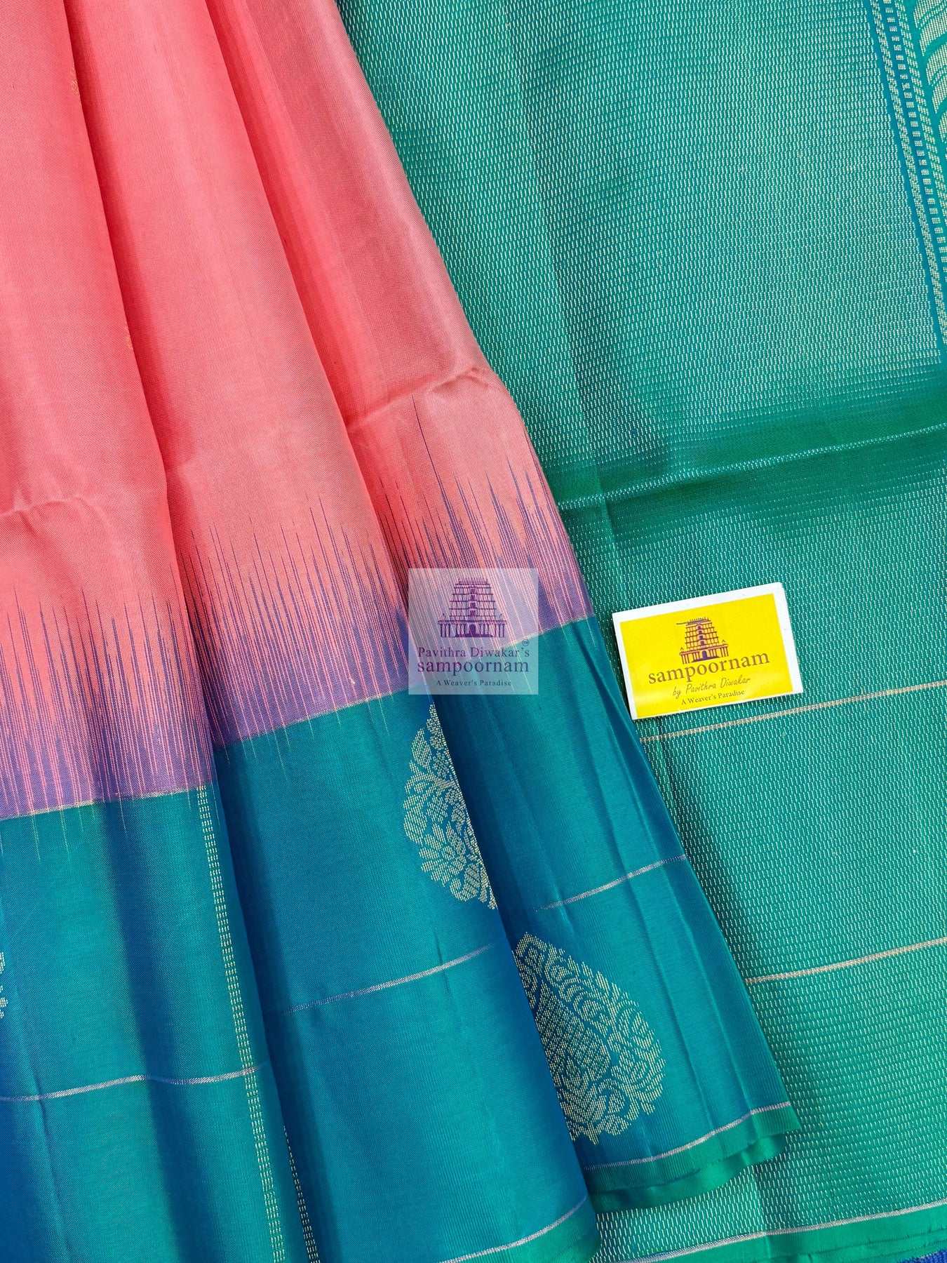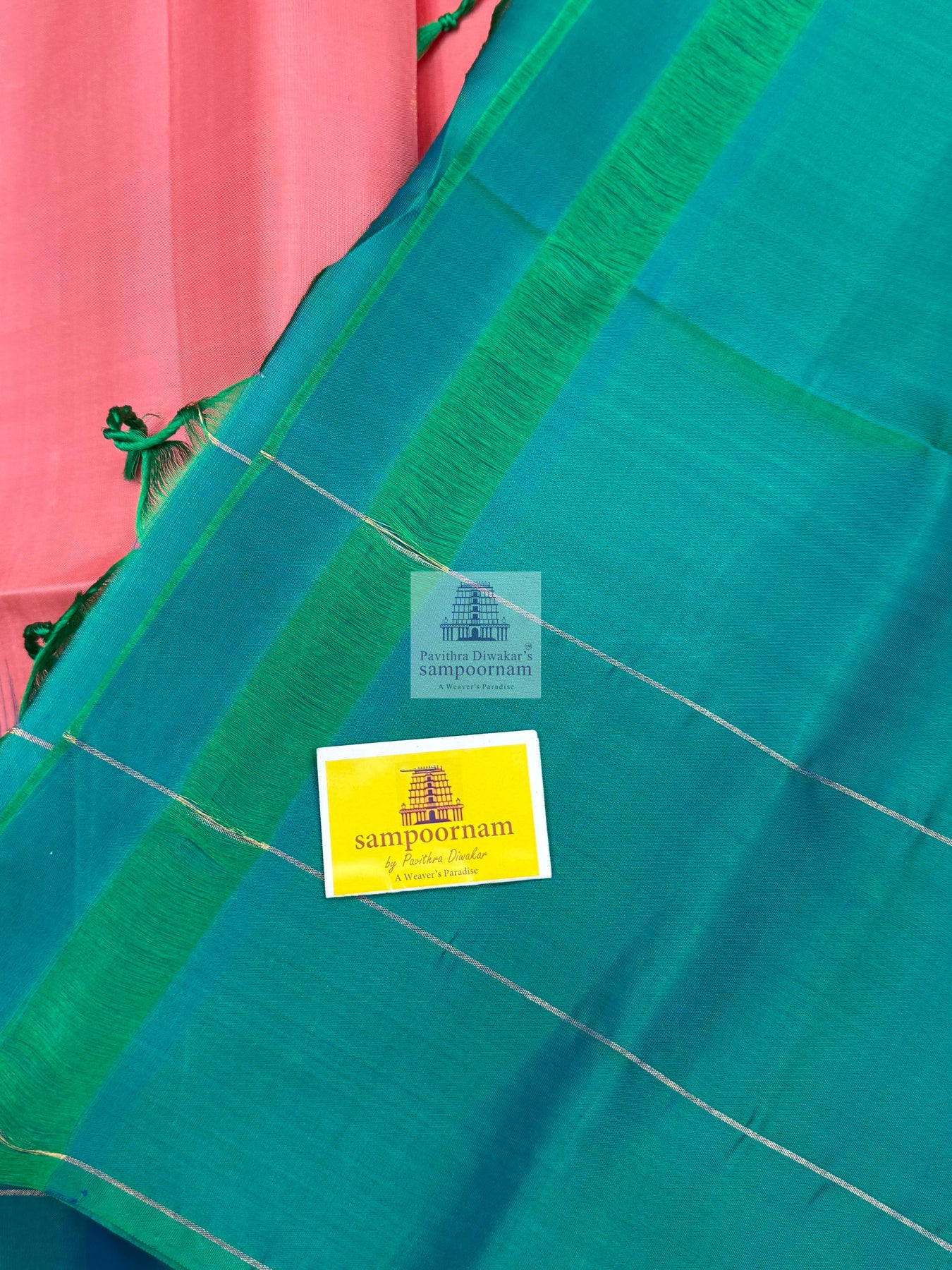 Baby Pink with Green , Vairaoosi lines in the border , rich Zari butta in the body and grand Pallu Pure Soft Silk Saree