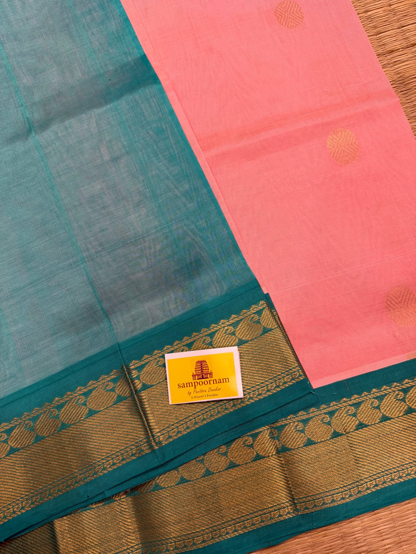 Baby Pink with Turquoise Blue rich body butta , traditional borders and rich Pallu Korvai Silk Cotton Saree