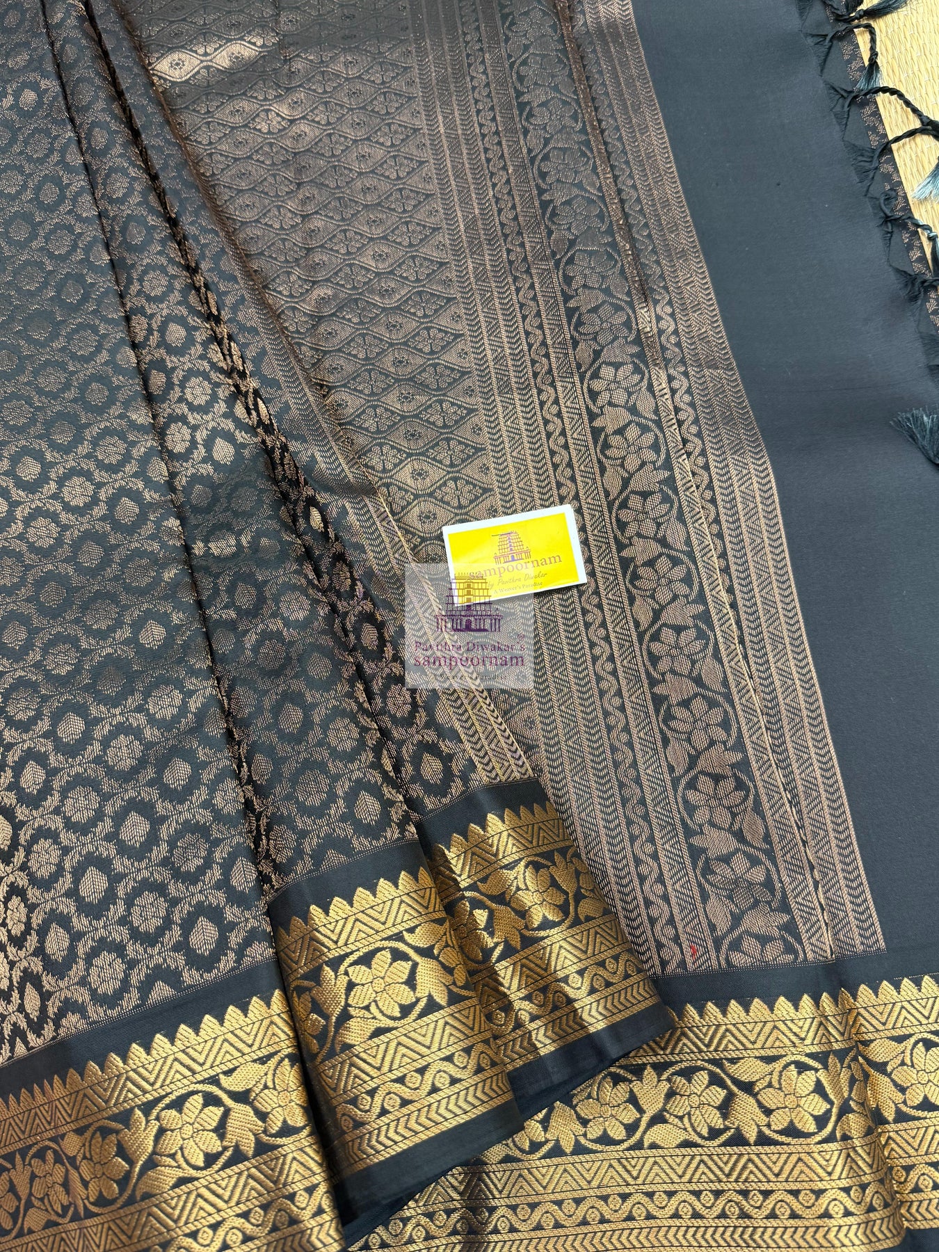 Black colour with Floral Banarasi rich Zari butta and Grand Gold Zari border Pure Soft Silk Saree