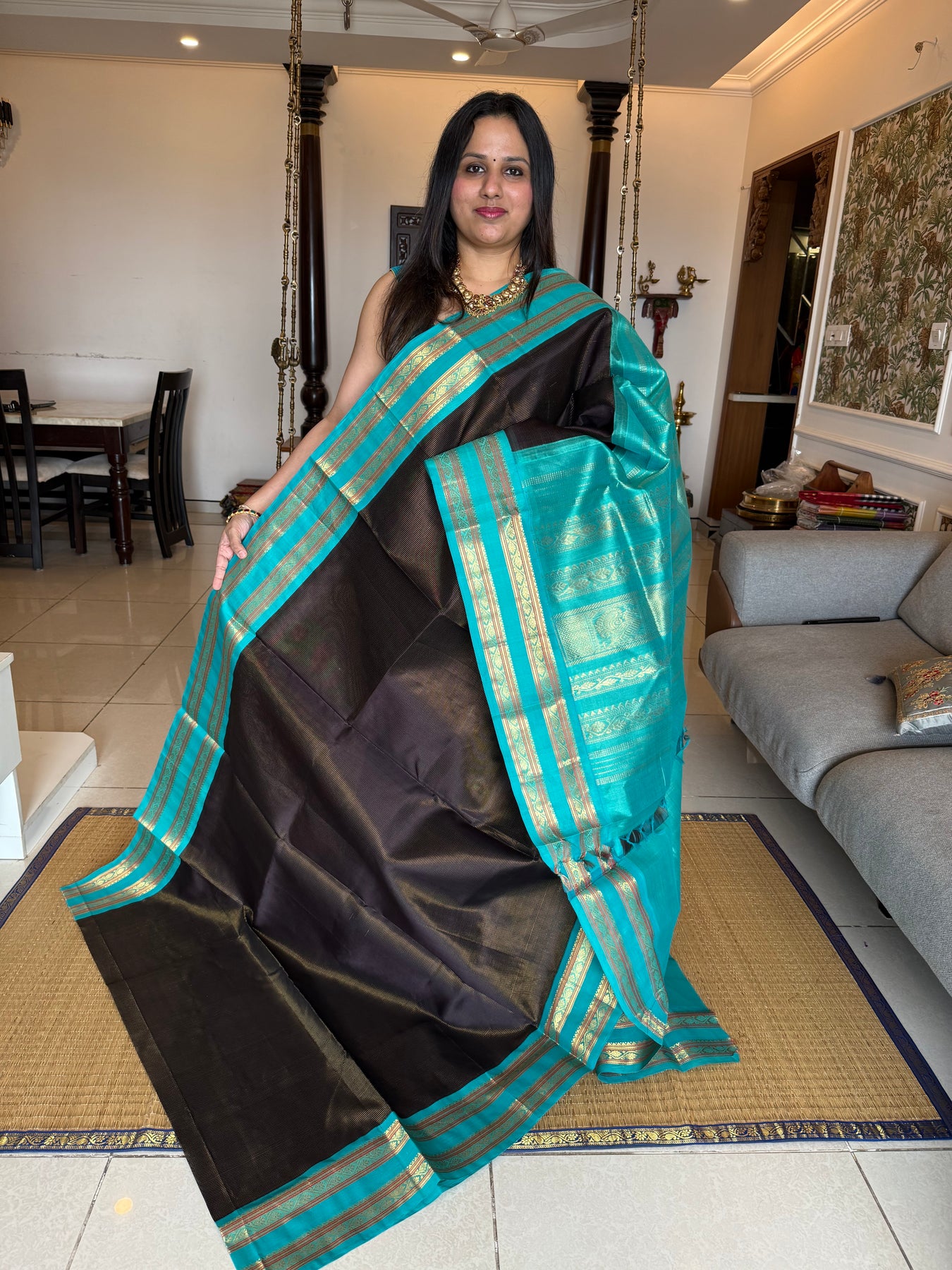 Black with Turquoise Blue ,Zari Podi Kattam in the body ,rettapet border and rich Pallu Korvai Silk Cotton Saree