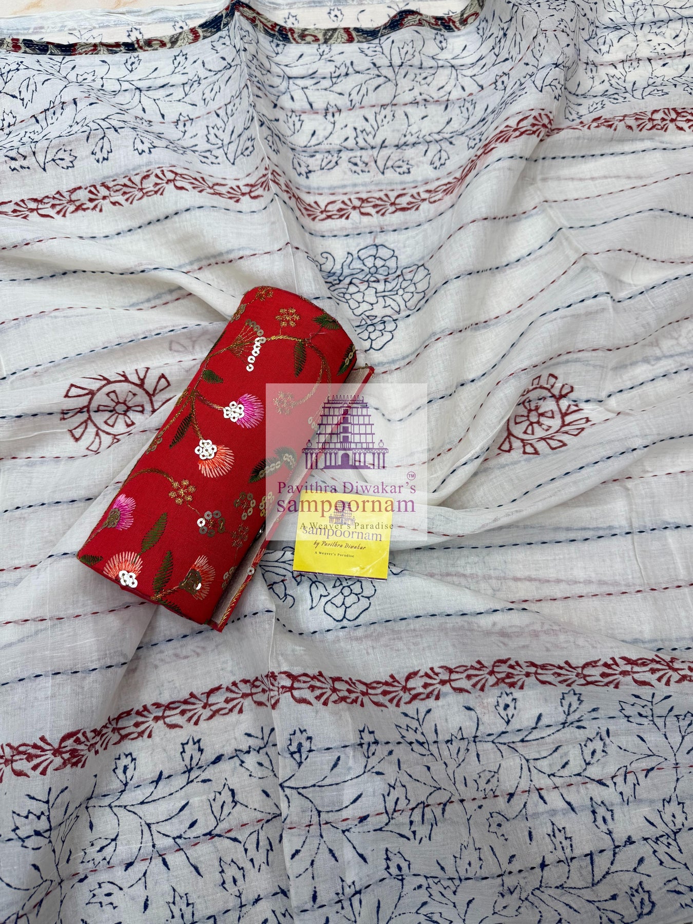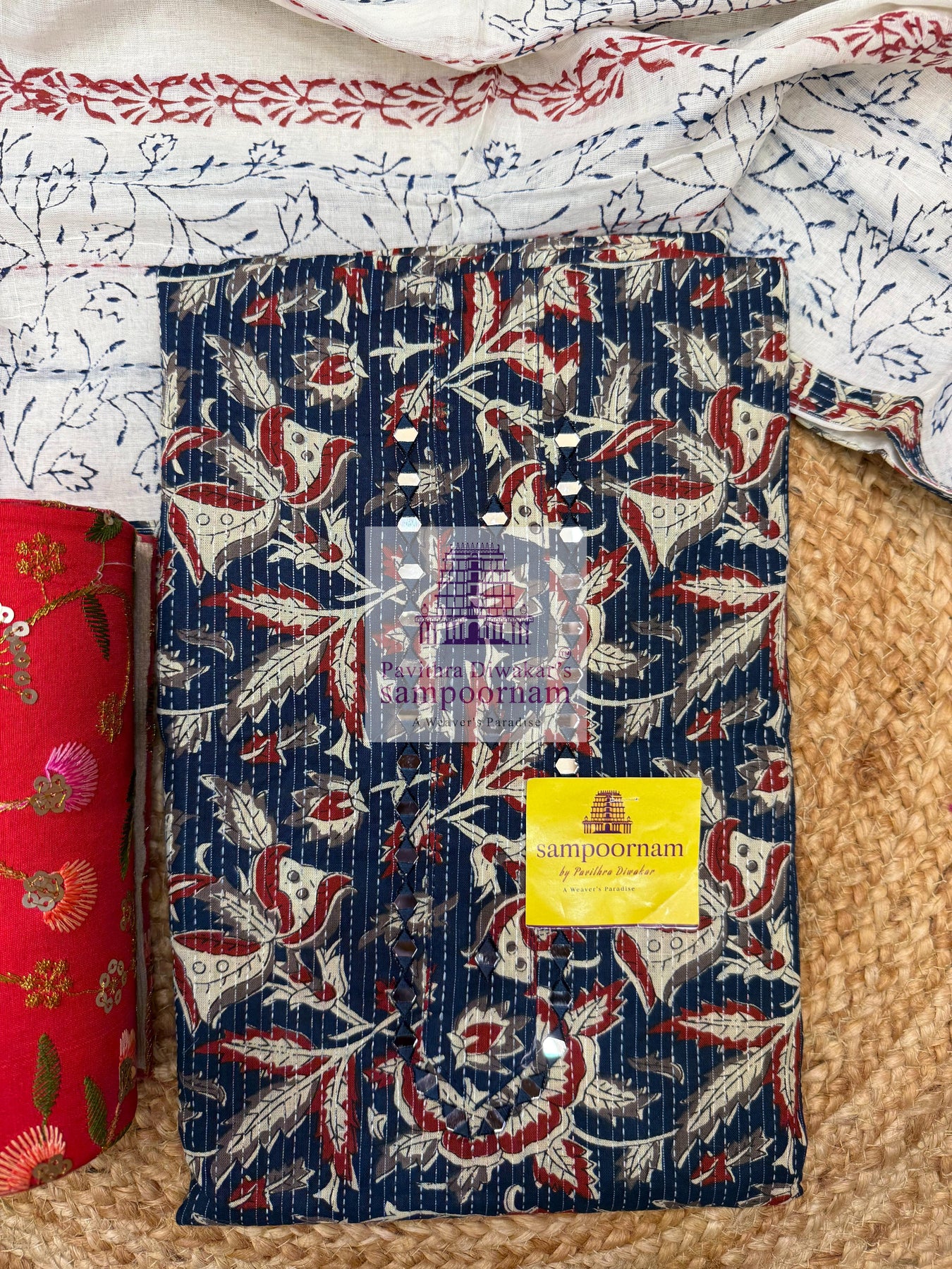 Blue Kantha Kalamkari printed top with Mirror work in the Yoke , Plain bottom and Kantha Handblock Printed Dupatta