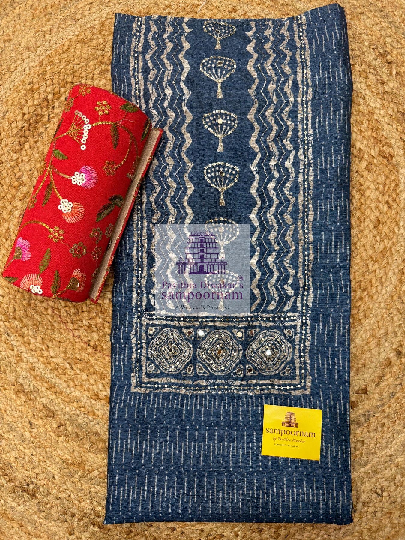 Blue Semi Tussar top with Printed Yoke and Mirror work , Plain Bottom and Printed Dupatta