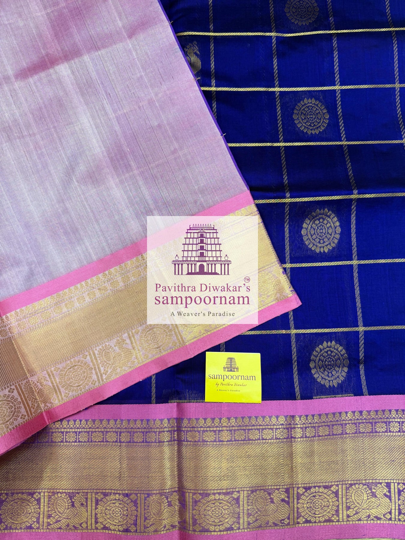 Blue with Baby Pink , rich Zari checks in the body , Mayil and Chakram rich butta in the body , traditional borders and rich Pallu Silk Cotton Saree