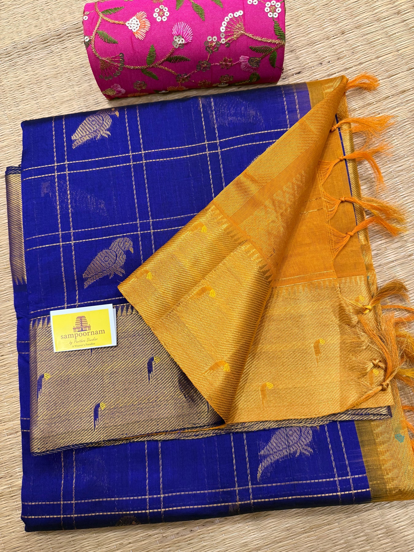 Blue with Mustard Paithani borders , parrot motifs in the body ,rich Pallu Korvai Silk Cotton Saree