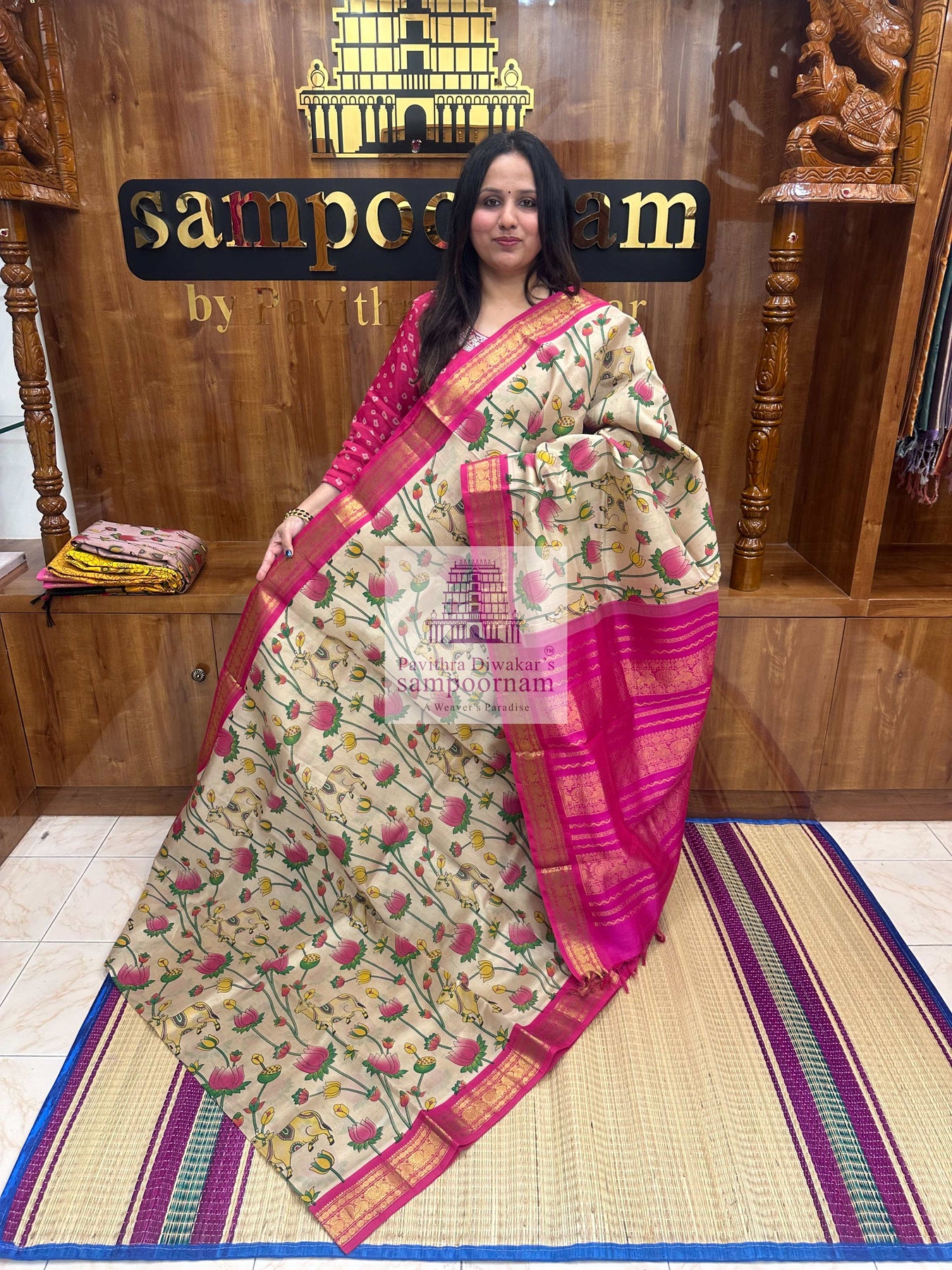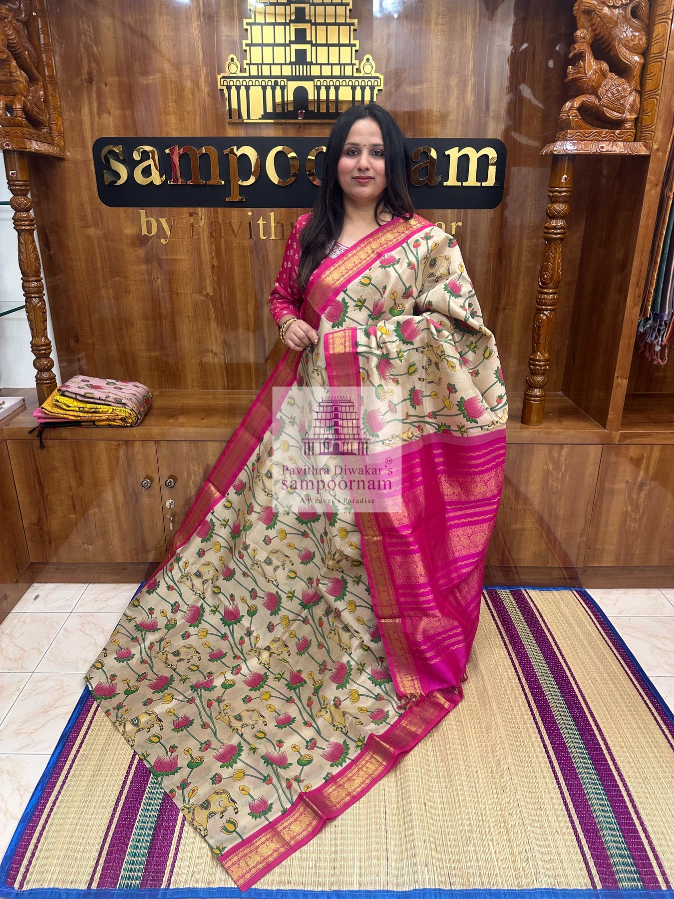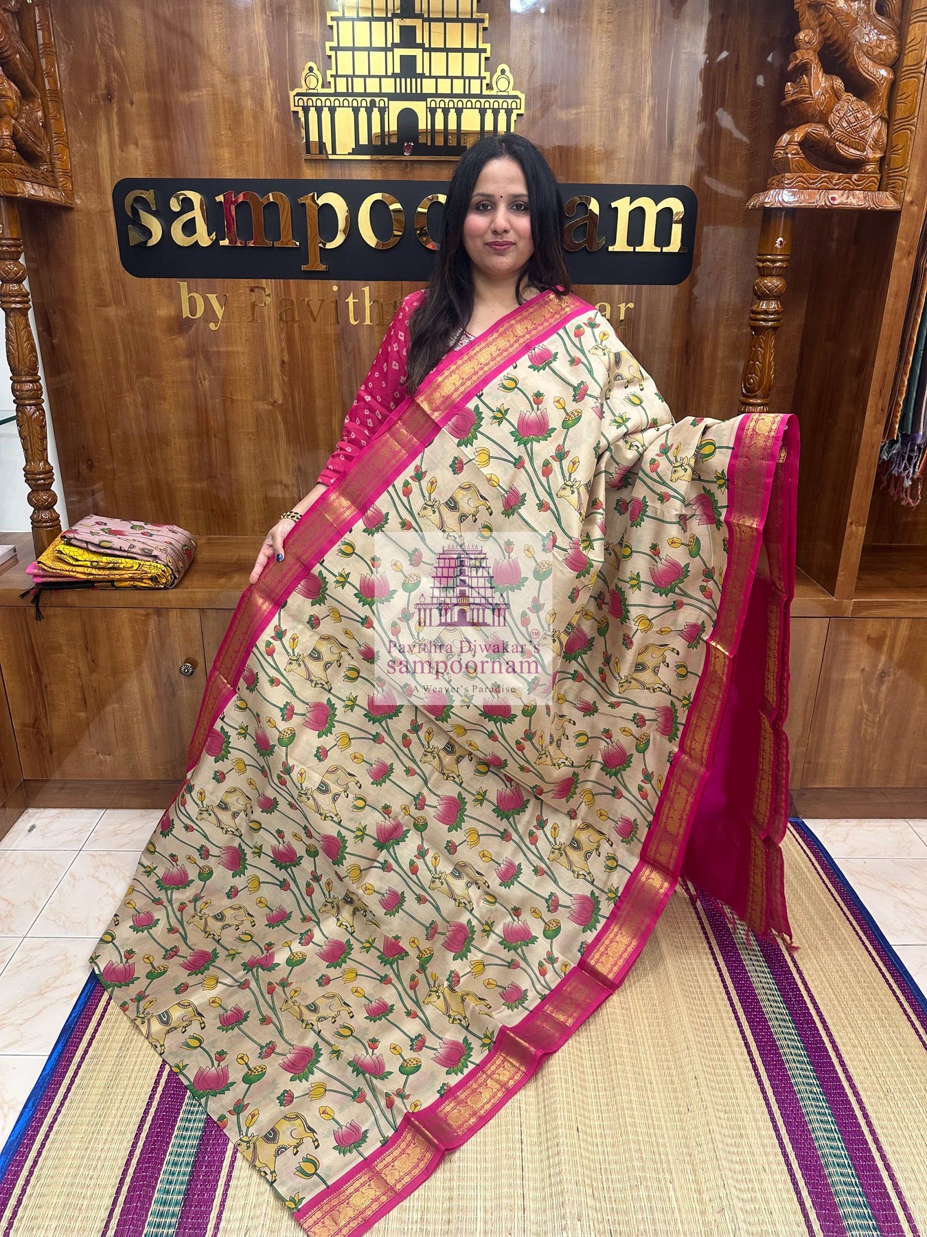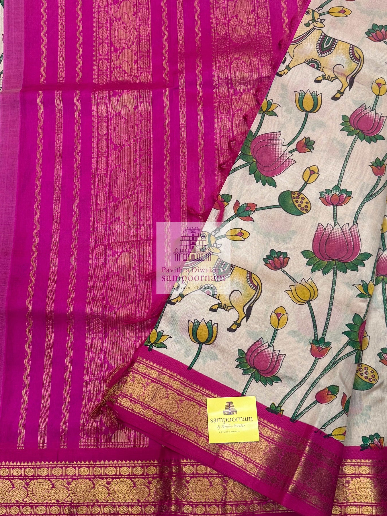 Offwhite with Pink , Traditional Borders and Rich Pallu Pichwai Printed Korvai Silk Cotton Saree