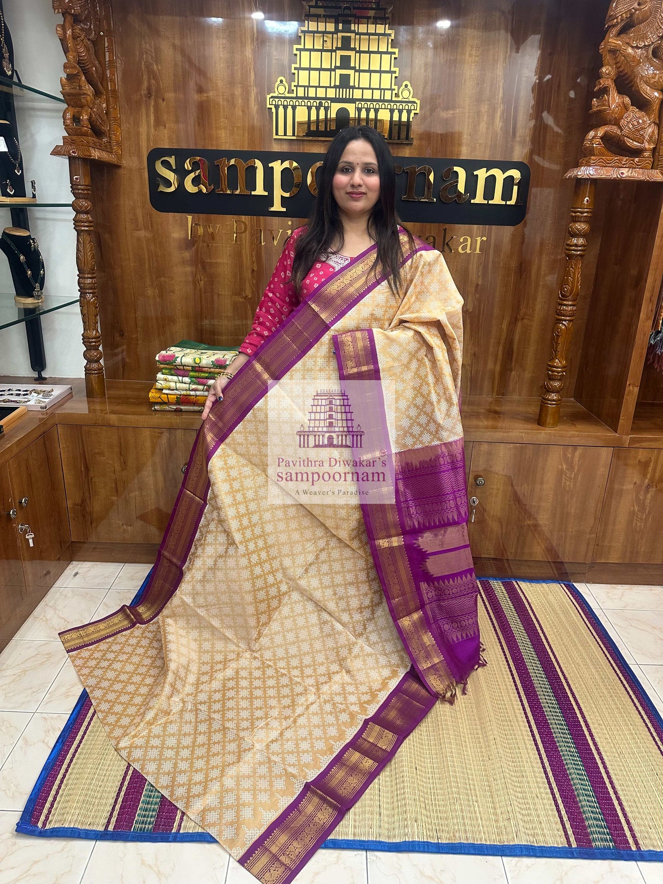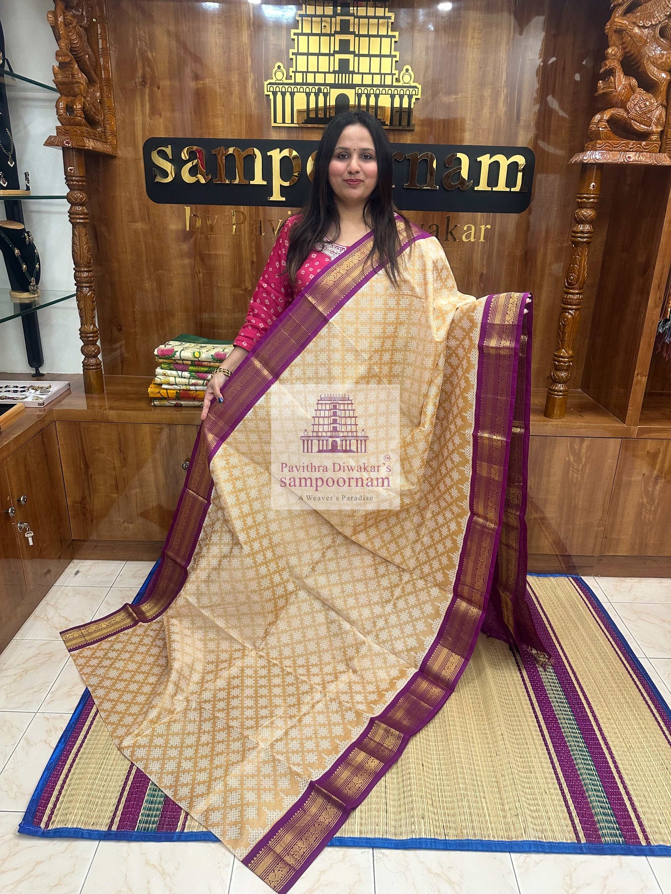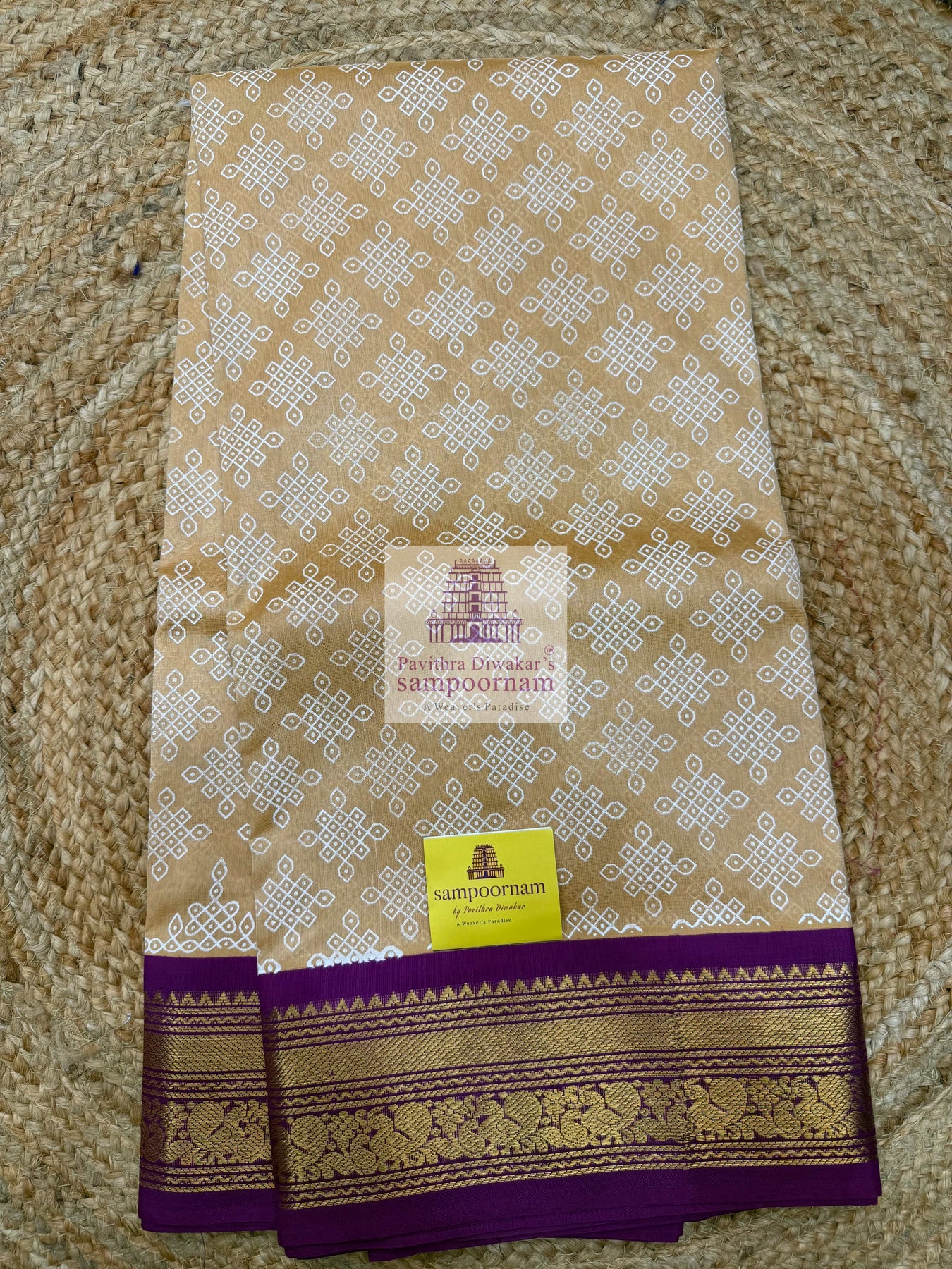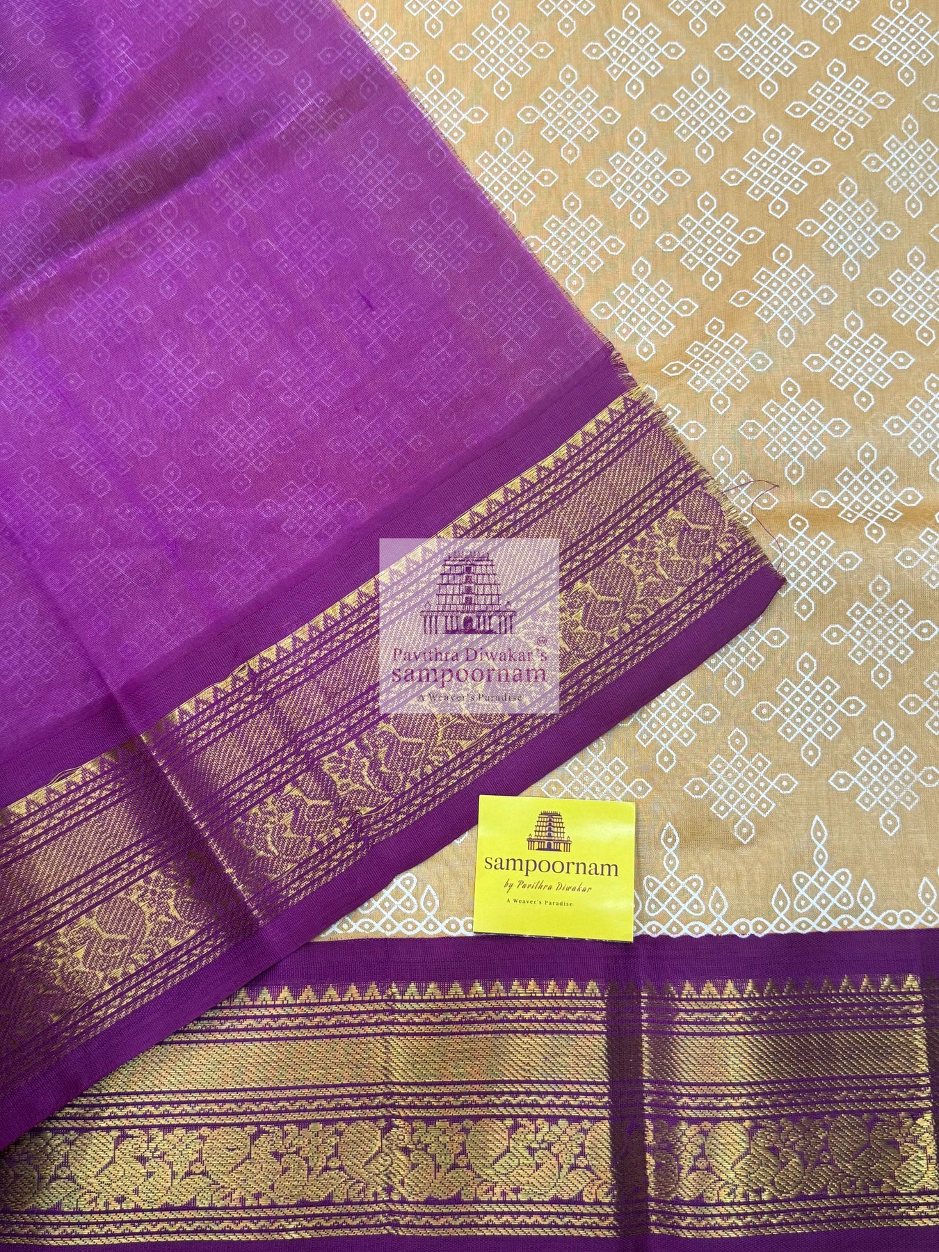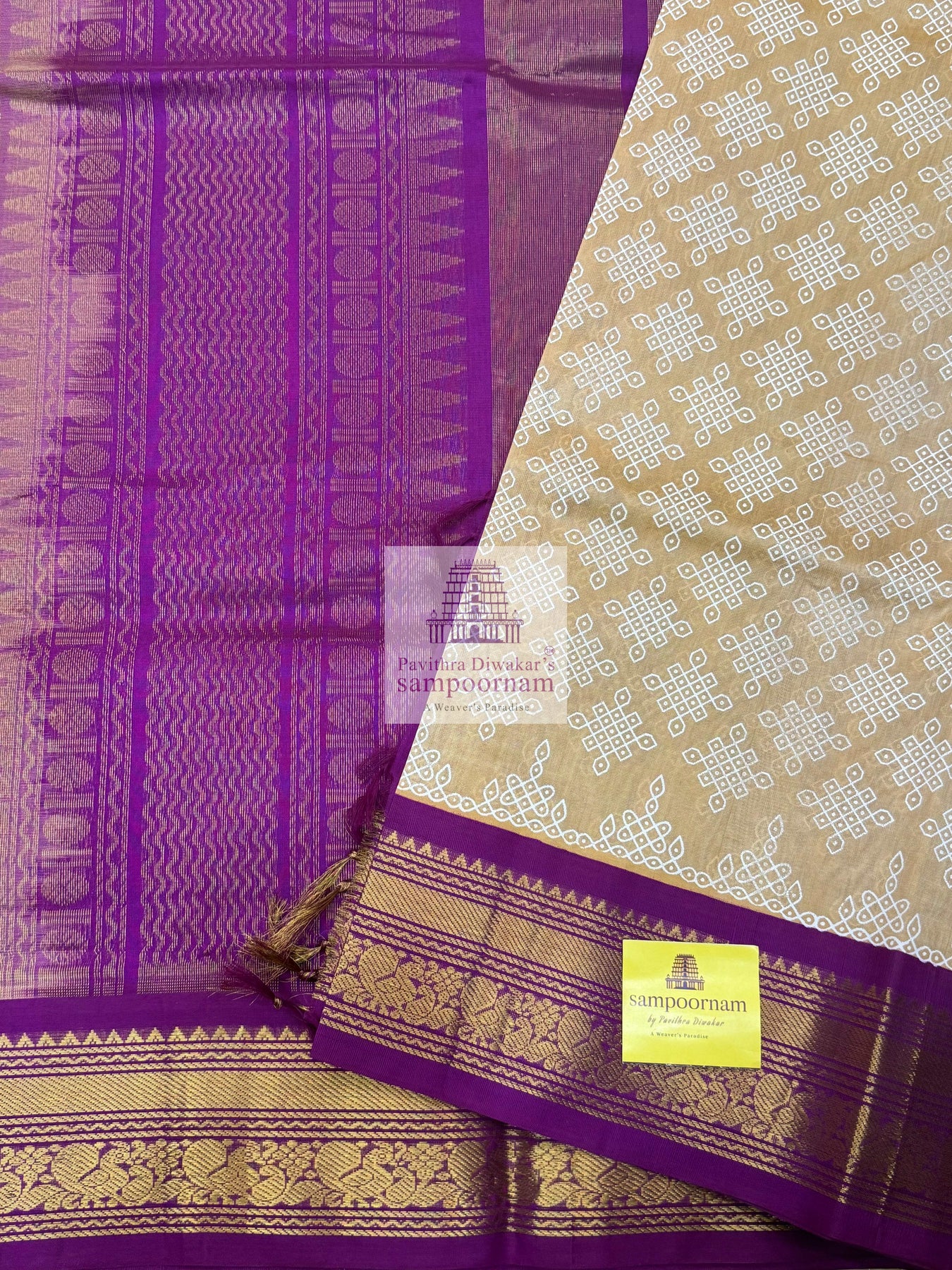Light Gold with Magenta , Kolam Prints all over the body , Traditional Rettapet border rich Pallu Korvai Silk Cotton Saree