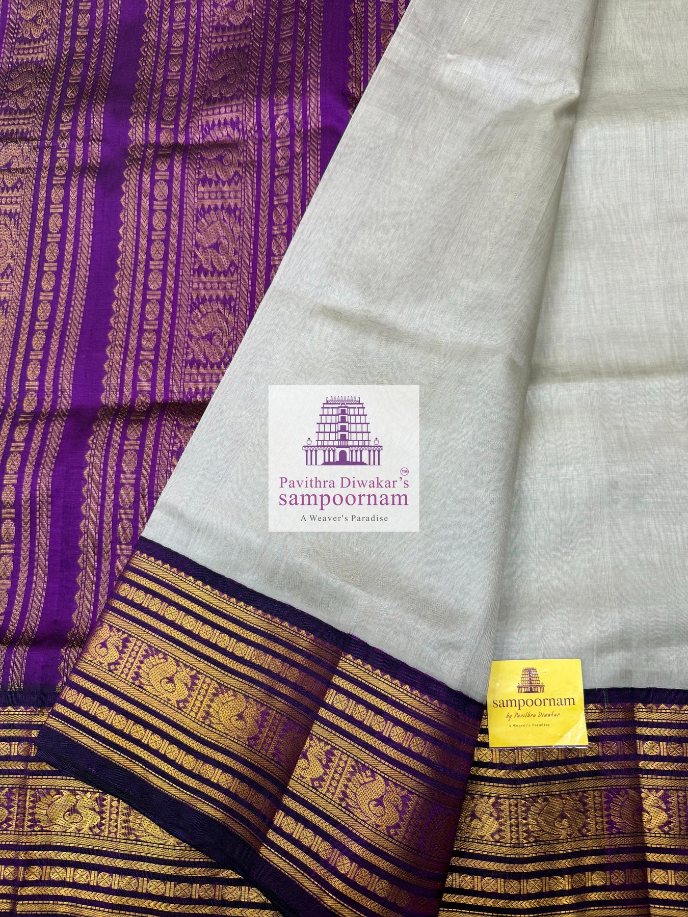 Light Grey with Purple , Kanchi traditional borders and rich Pallu Korvai Silk Cotton Saree