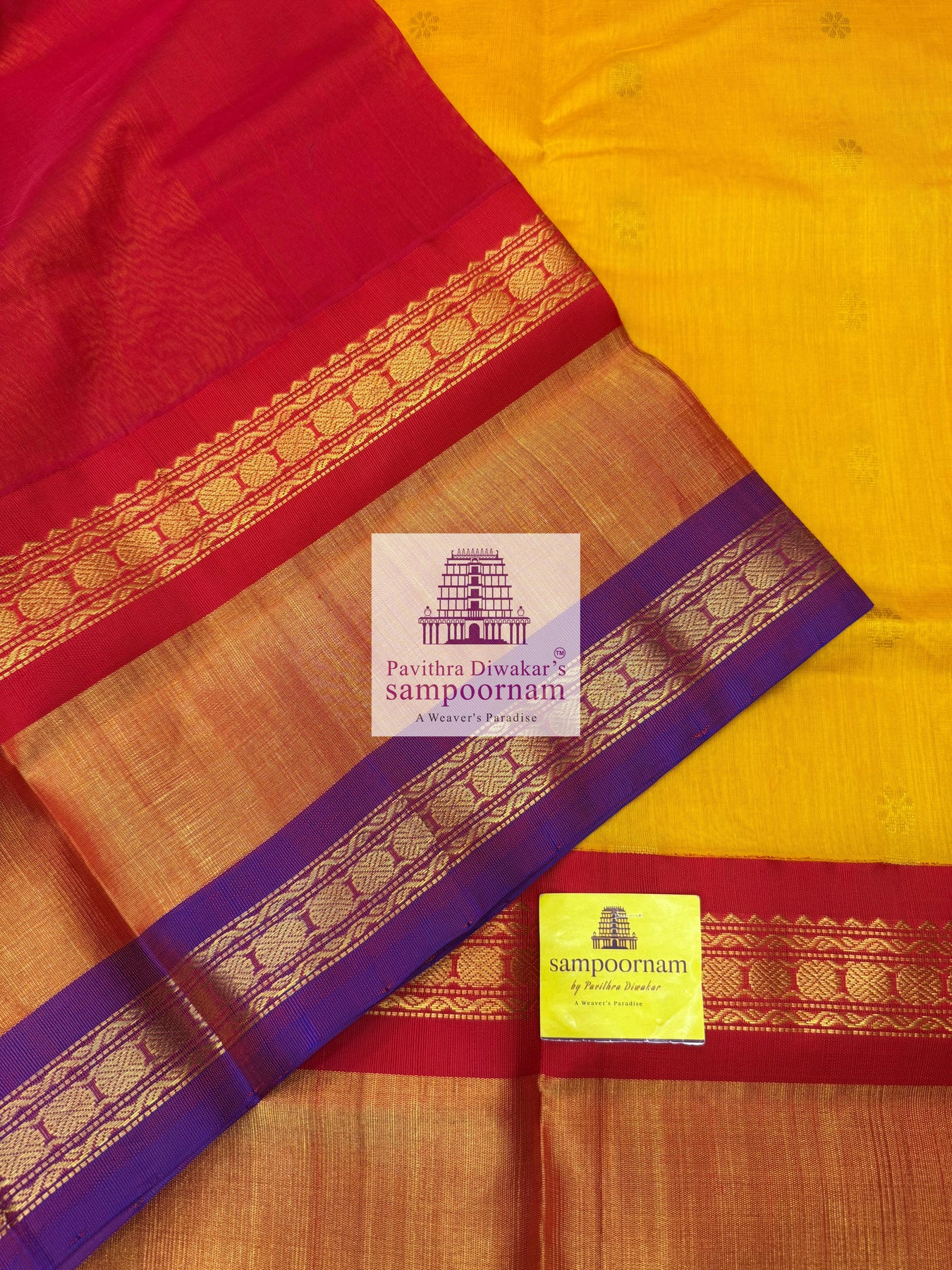 Mambazha Manjal with Red , one side Triple long Tissue border and rich Pallu Korvai Silk Cotton Saree