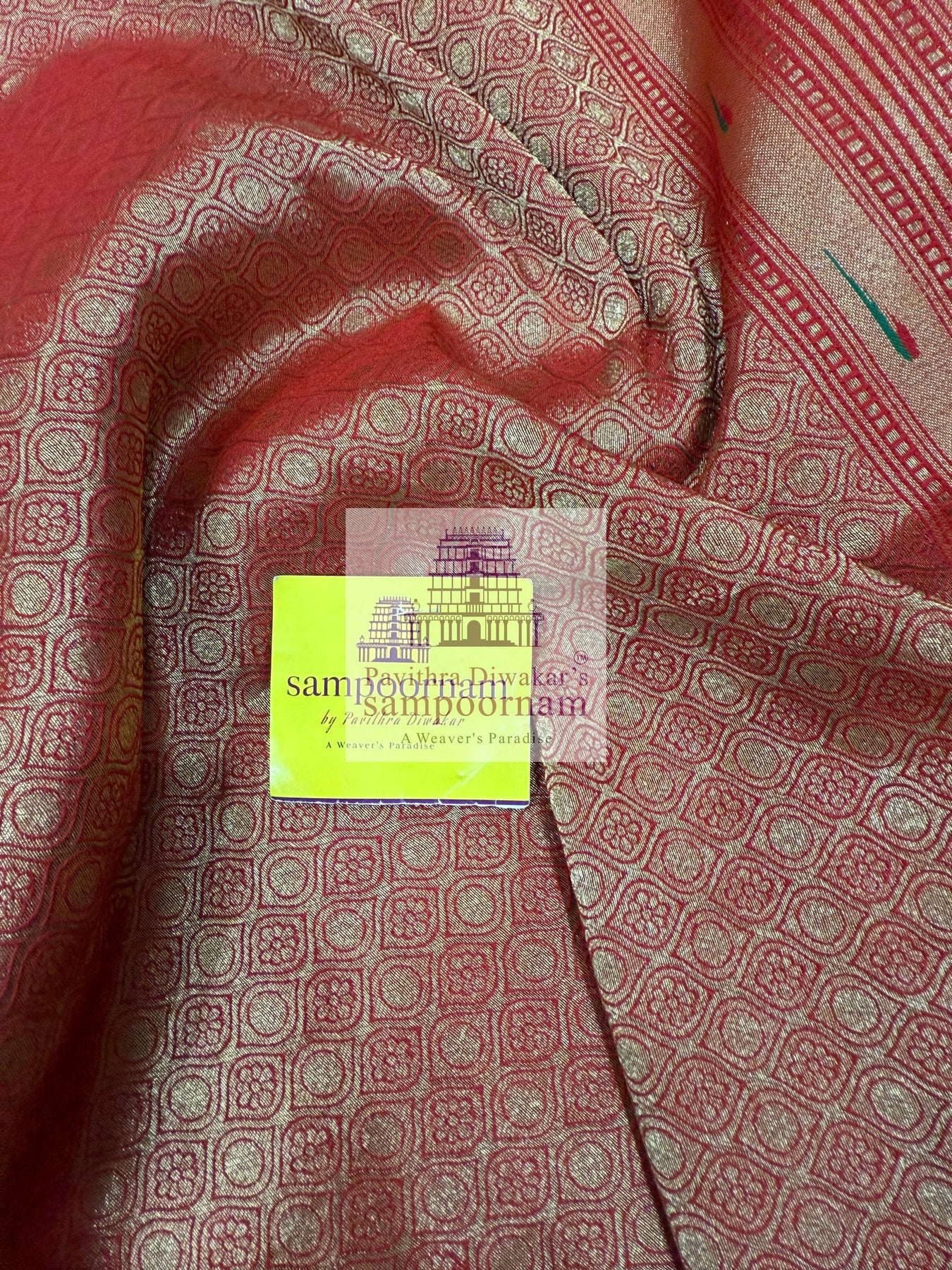 Maroon with Red , Bandhini prints in the body , with Paithani rich Zari borders and Pallu , Banarasi blouse , Pure Vegan Silk Saree