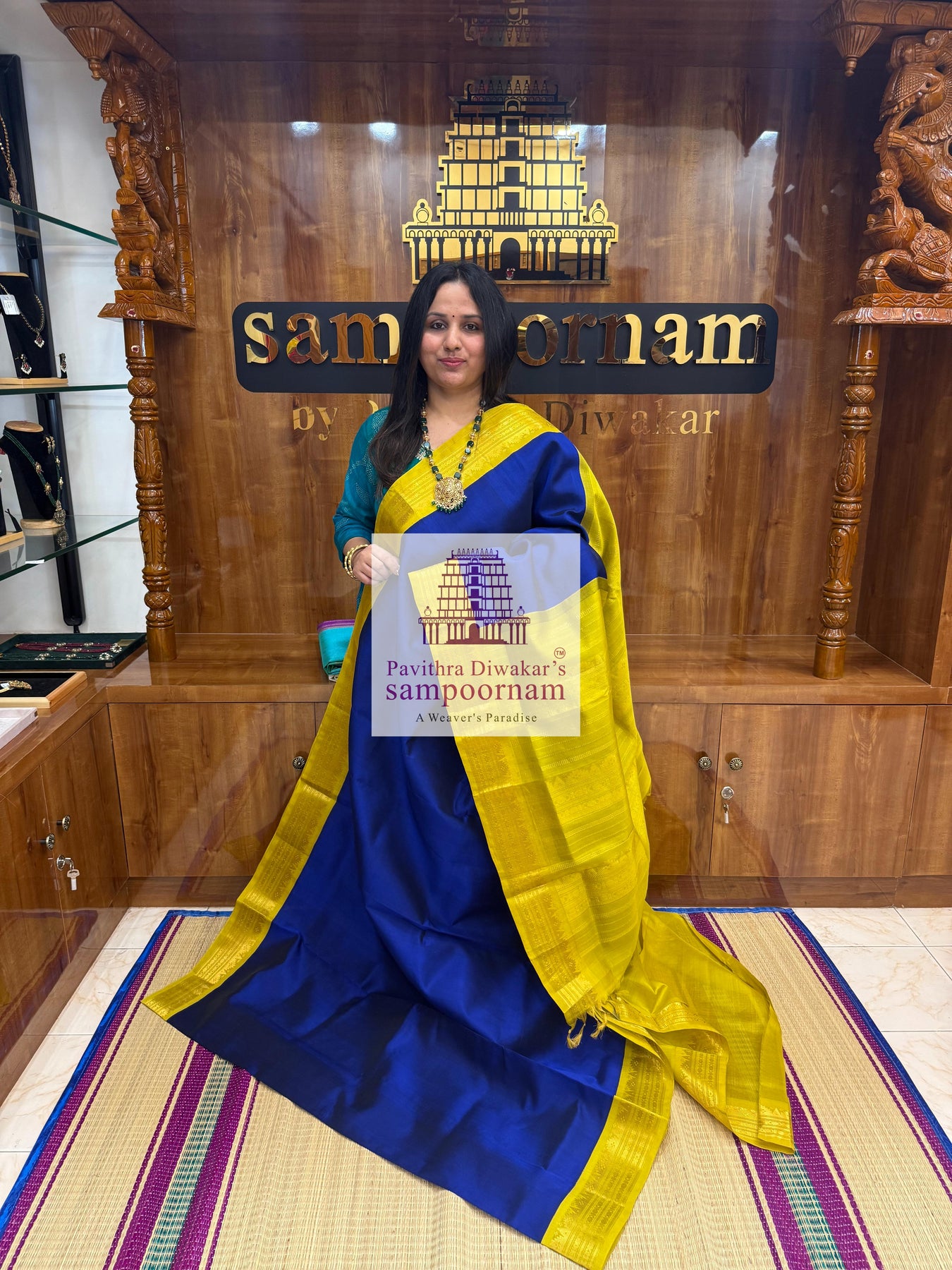 MS Blue with Lemon green  , traditional borders and rich Pallu Korvai Silk Cotton Saree