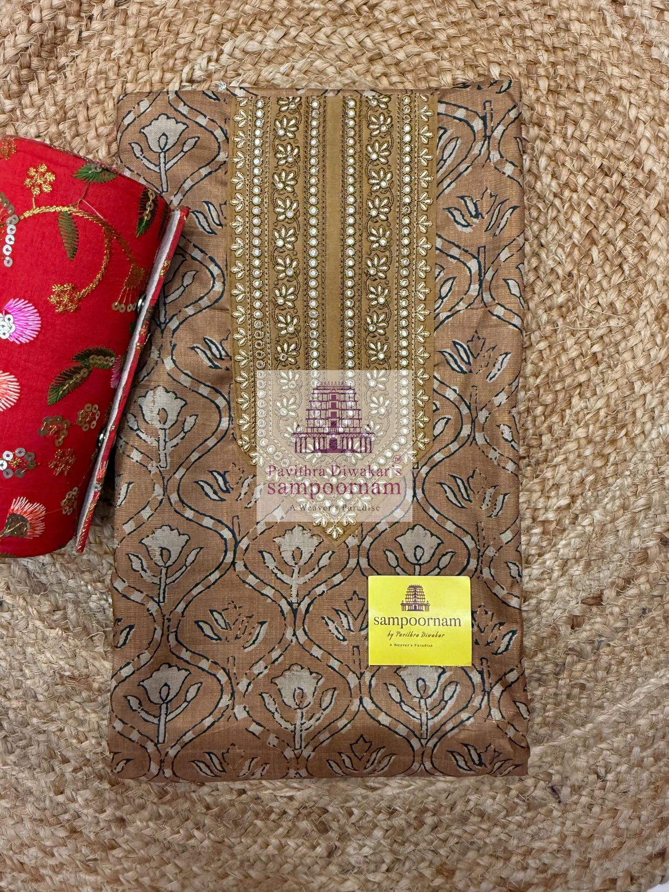 Mustard Floral Print top with Embroidary Yoke and Plain Bottom with Printed Dupatta - Semi Tussar Salwar Material