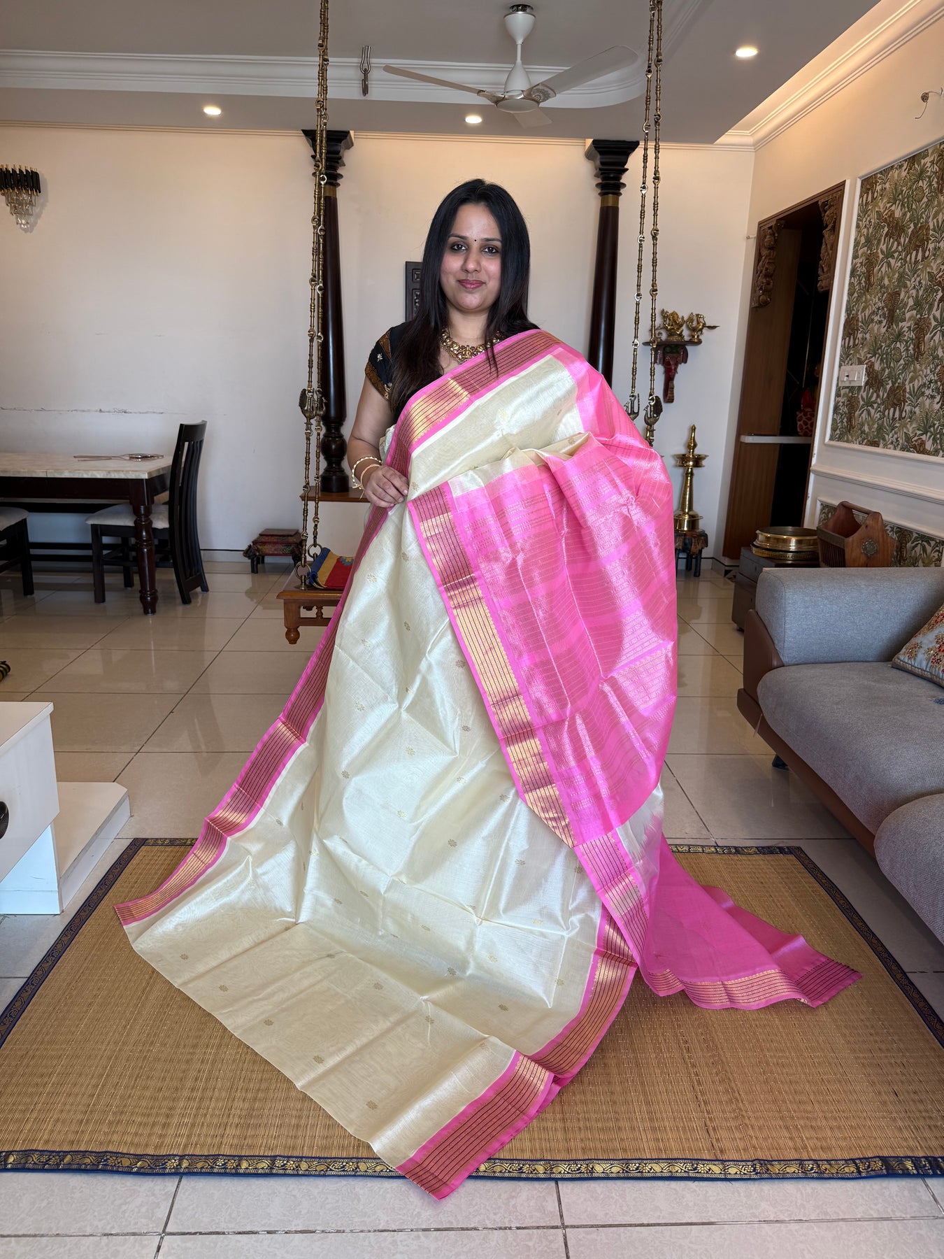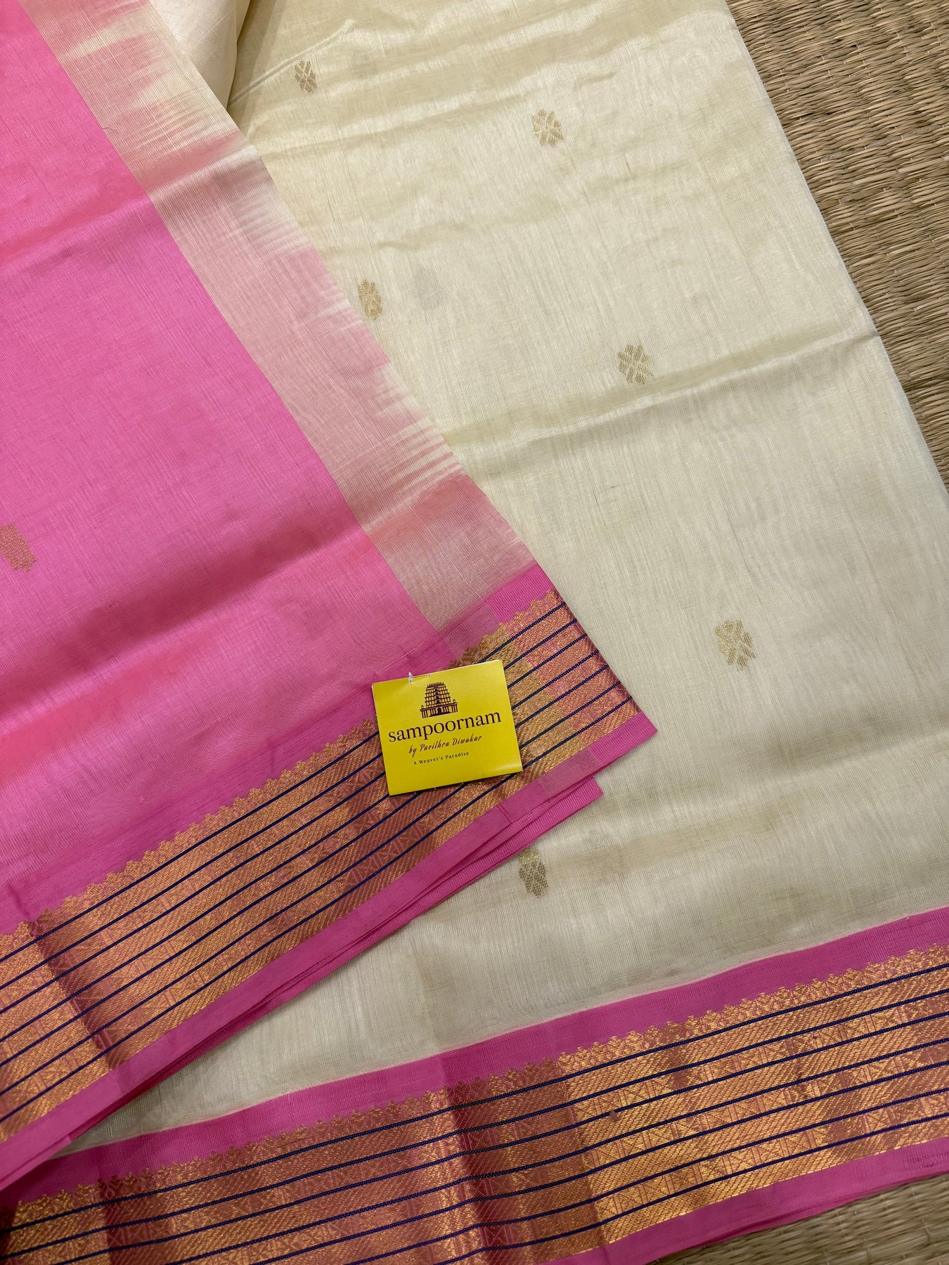 OffWhite with Baby Pink , rich zari butta in the body , traditional borders and rich Pallu Korvai Silk Cotton Saree