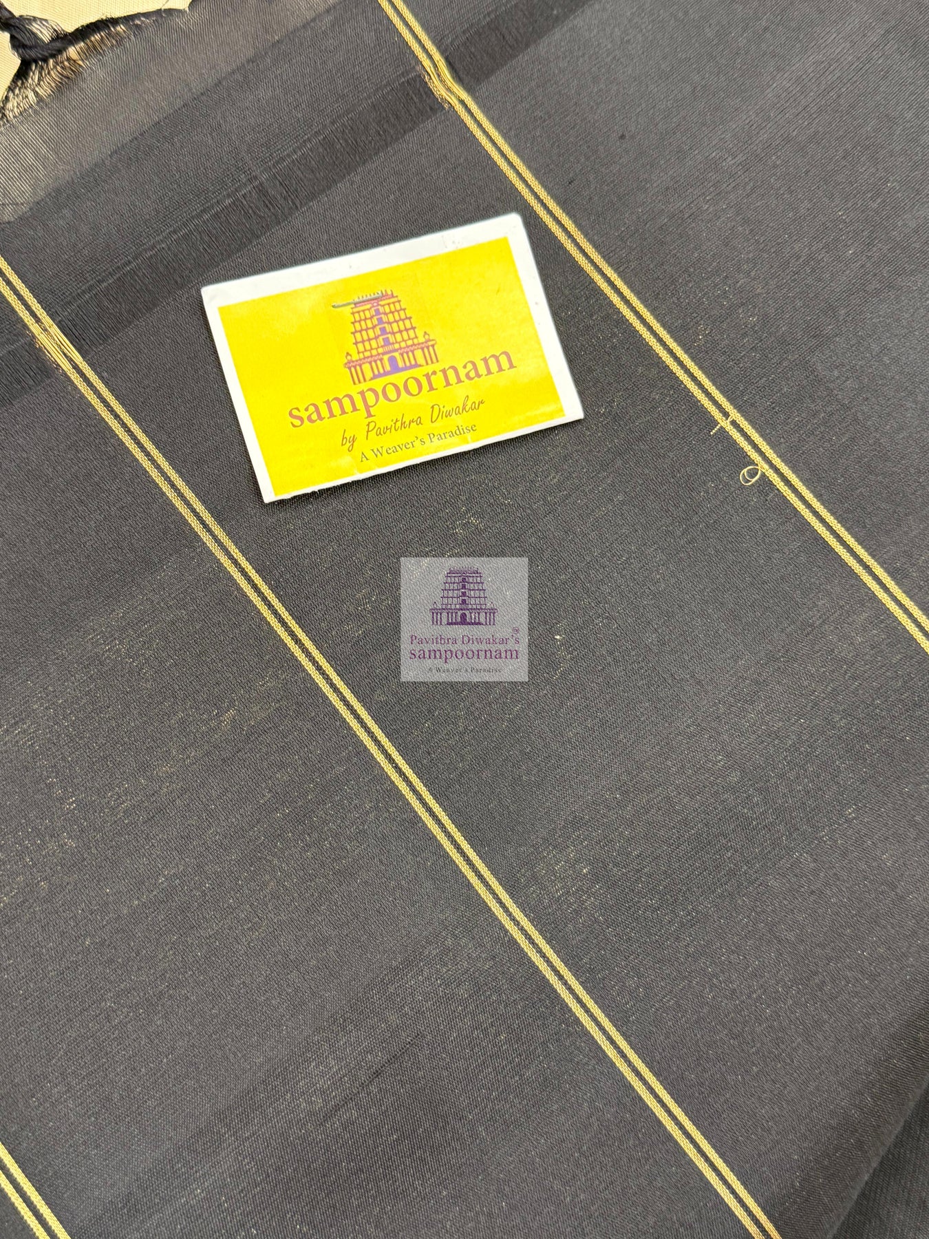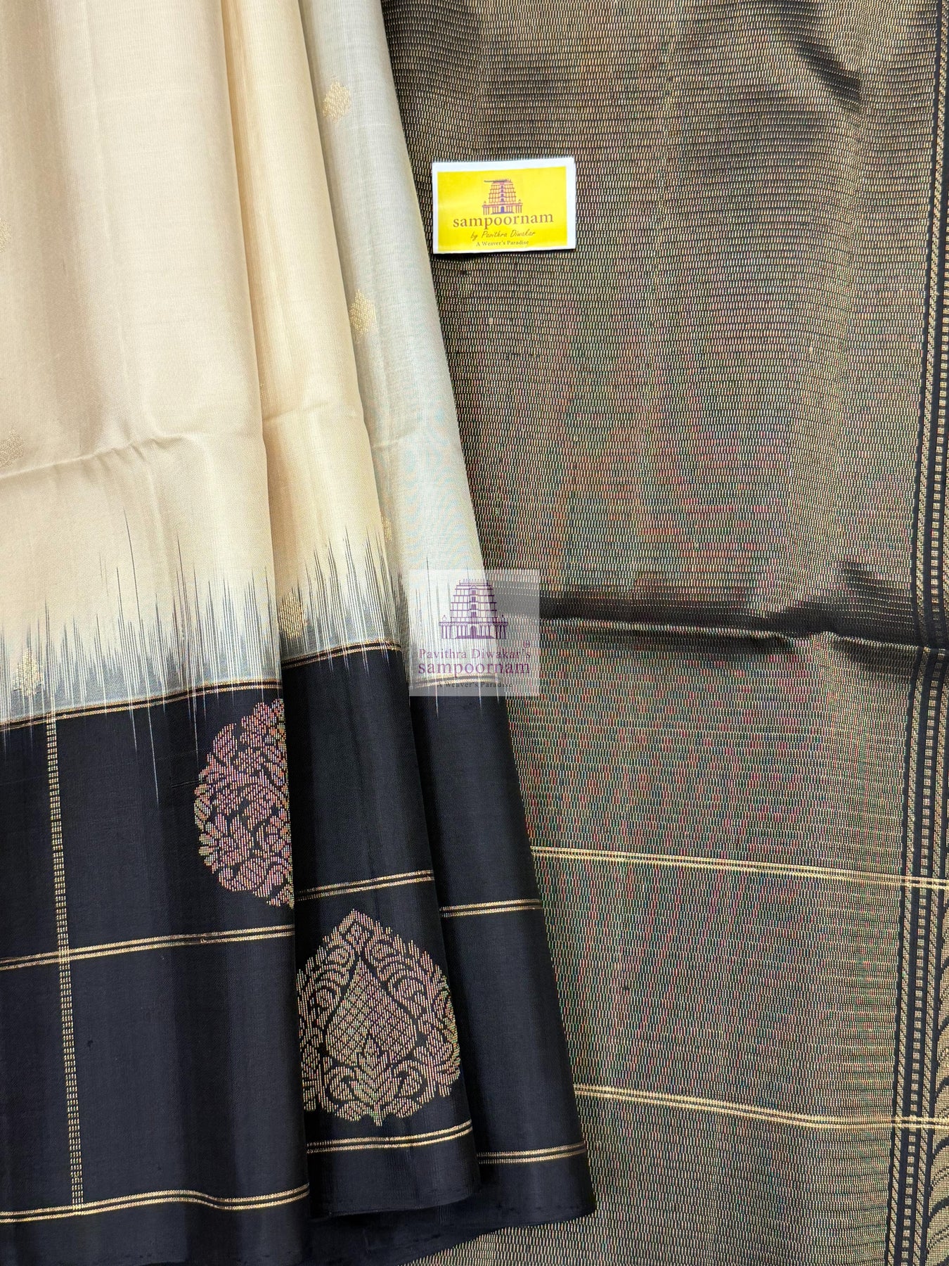 Offwhite with Black , one side big border , Vairaoosi lines and rich Zari butta in the body and grand Pallu Pure Soft Silk Saree