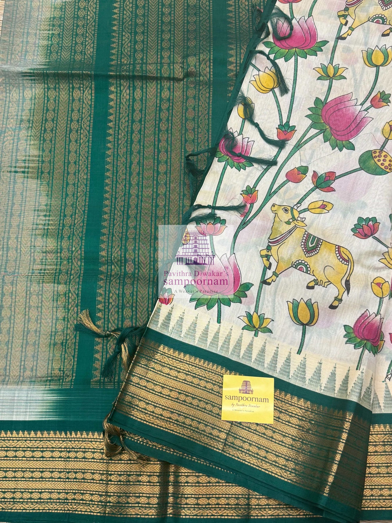 Offwhite with Green , Traditional Temple Border ,Pichwai Printed Korvai Silk Cotton Saree
