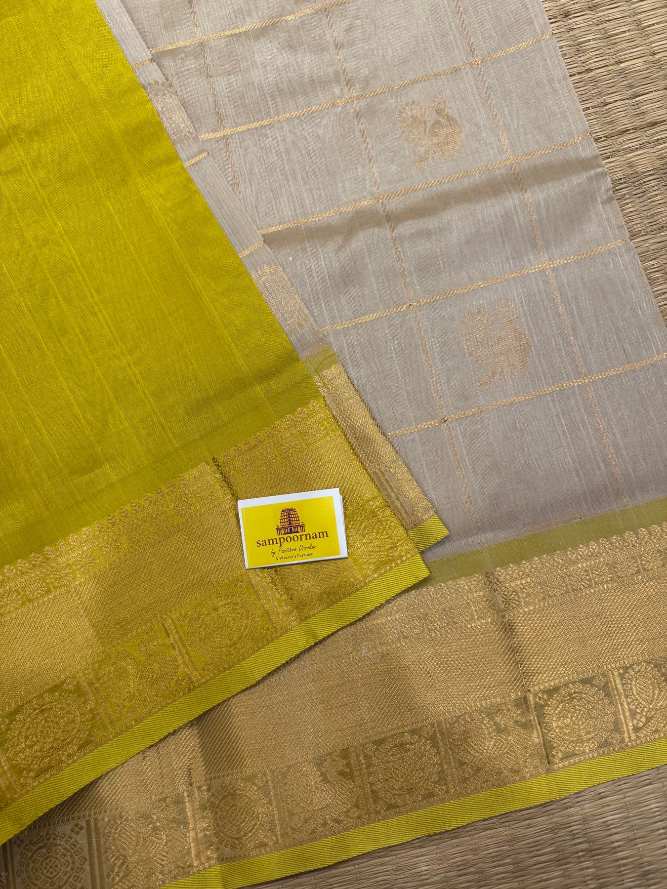 Offwhite with Lemon Yellow , rich Zari checks in the body , Mayil and Chakram butta ,traditional borders and grand Pallu Silk Cotton Saree