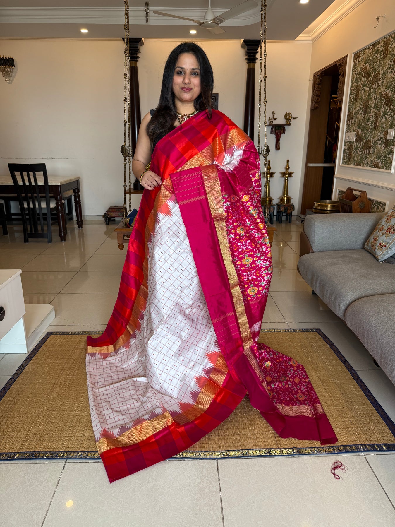 Offwhite with Pink , body checks and temple border , blouse design and rich Pallu Pochampally Ikkat Silk Saree