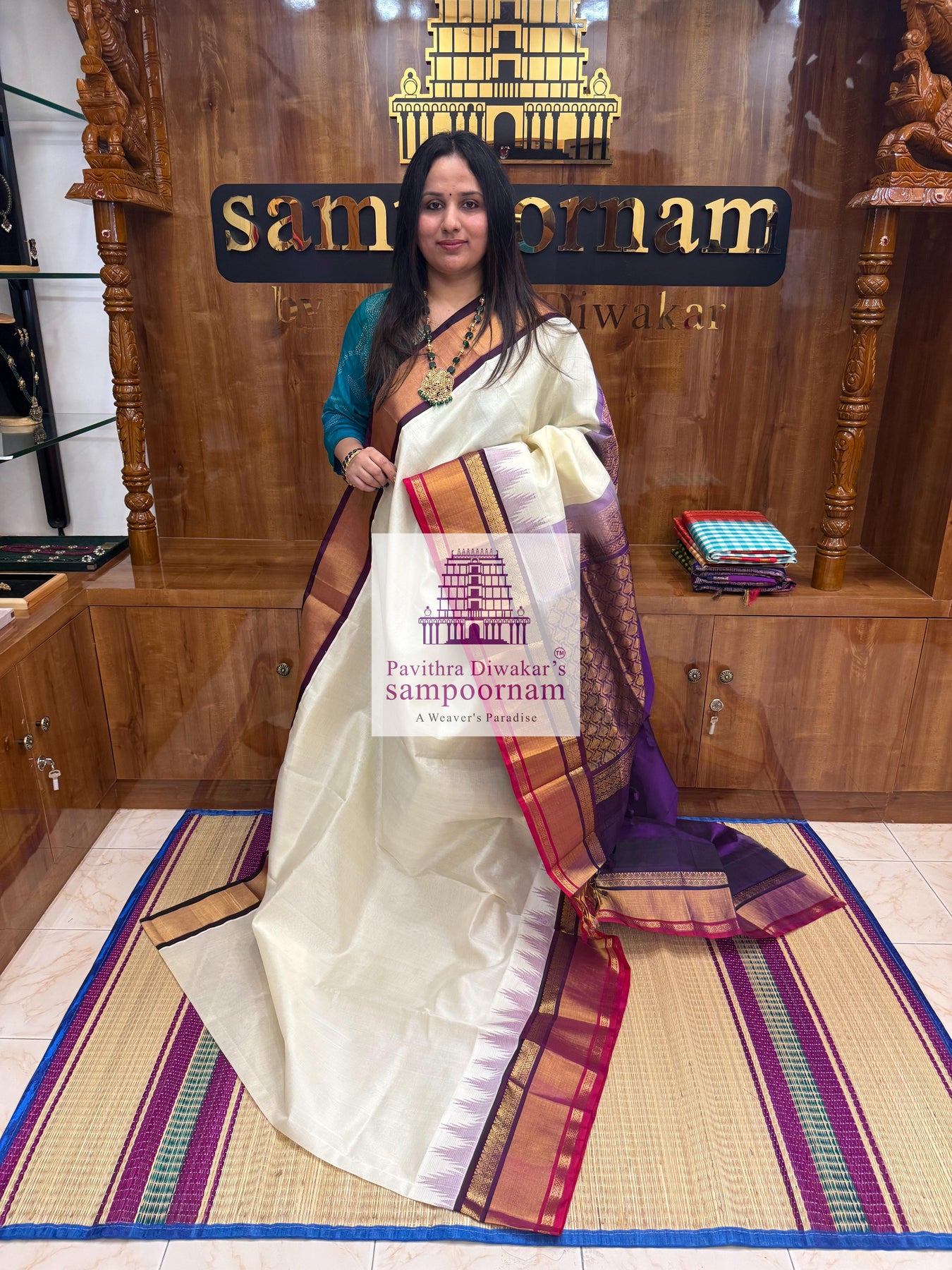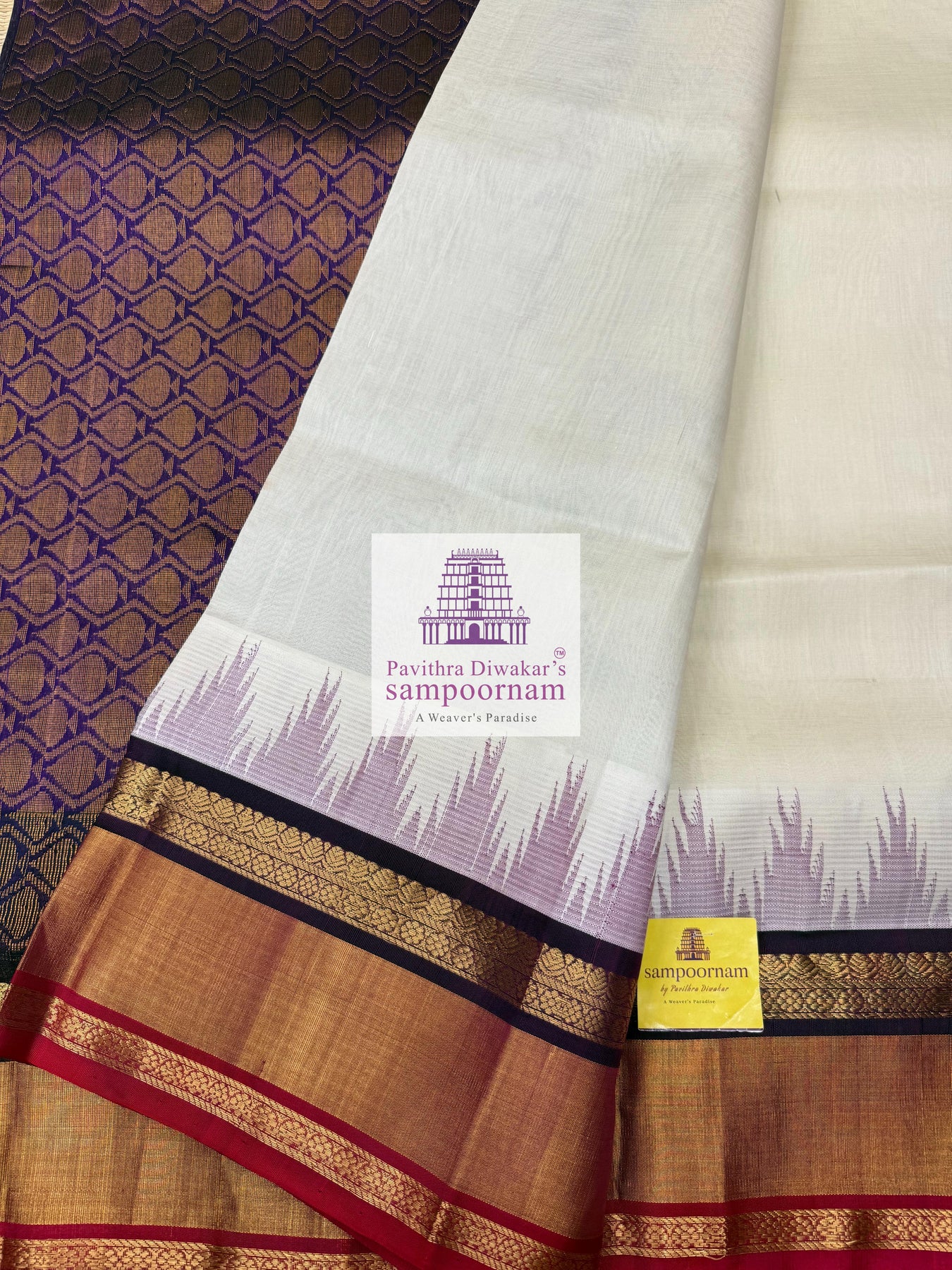 Offwhite with Purple , One side triple coloured rich Temple Tissue border , Grand Pallu Korvai Silk Cotton Saree