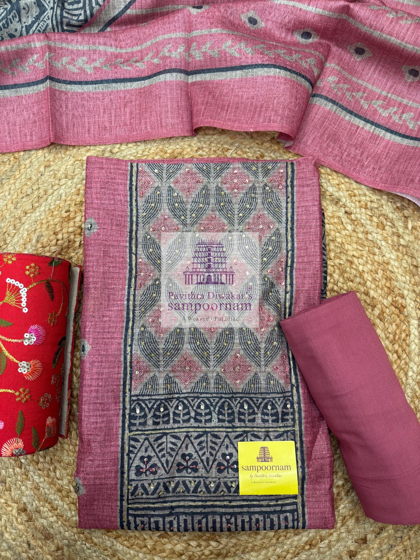 Pink Semi Tussar with Patchwork and Embroidery in the Yoke , Plain Bottom and Printed Dupatta