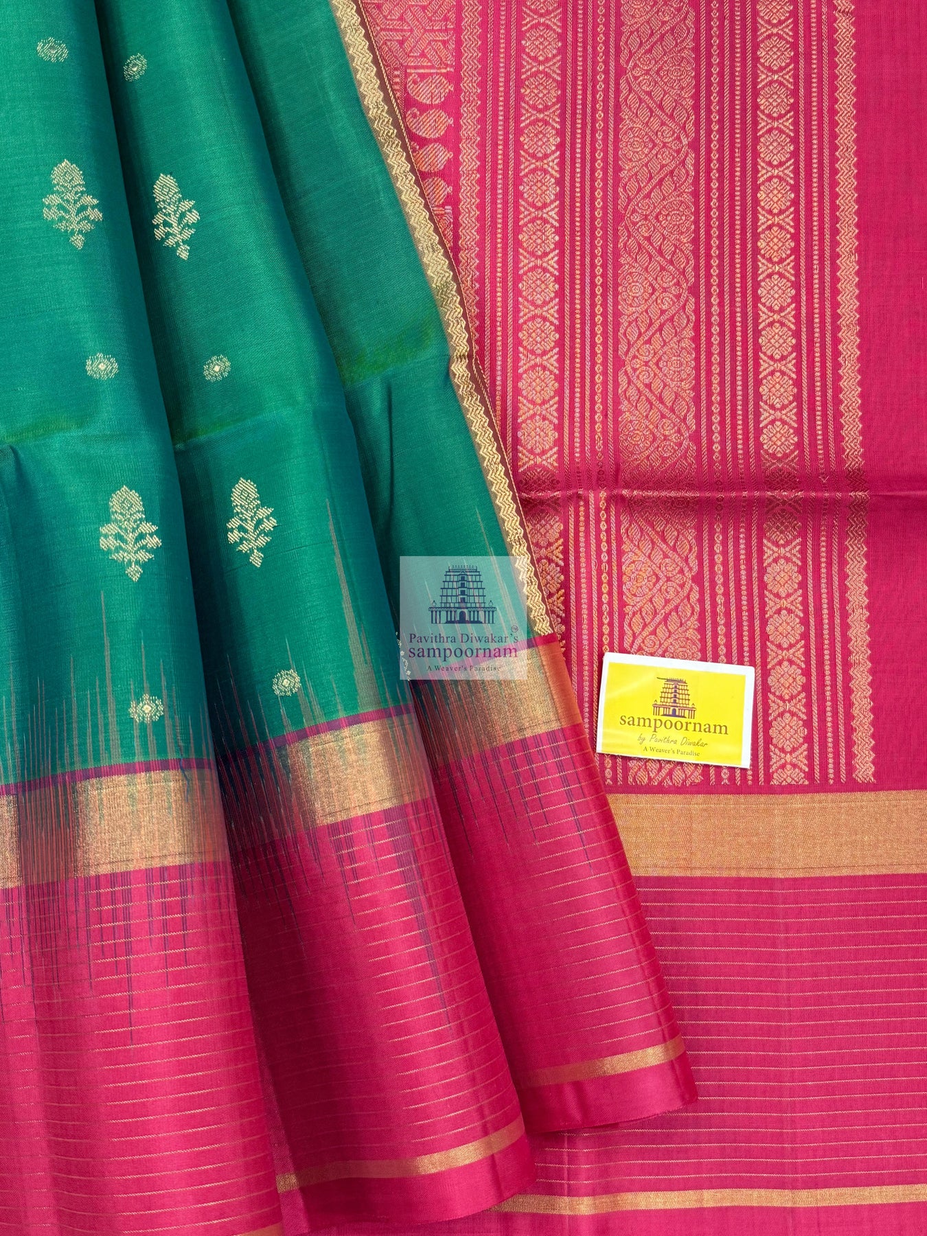 Ramar Green with Pink , Vairaoosi lines in the border , rich Zari butta in the body and grand Pallu Pure Soft Silk Saree