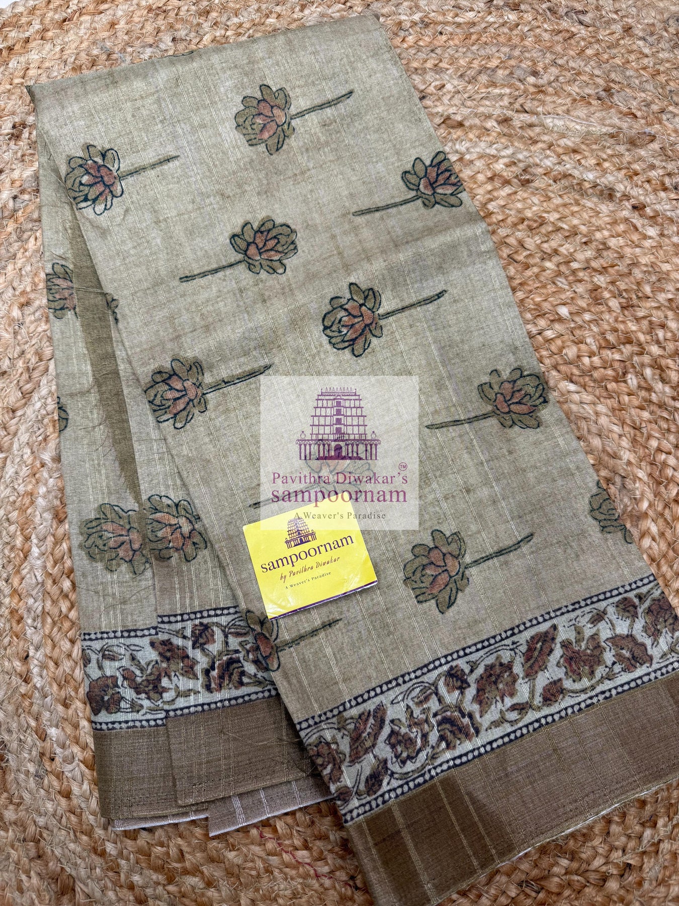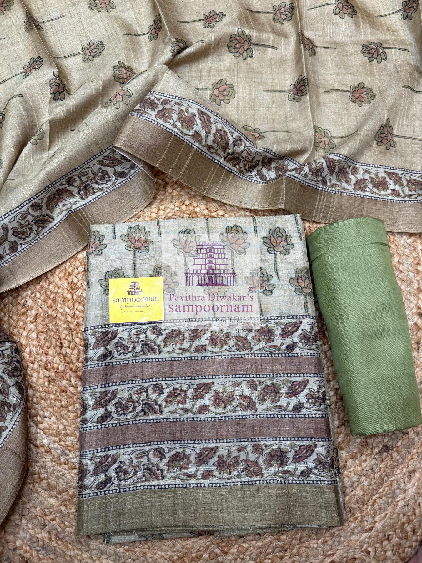 Semi Tussar - Olive Green Top with Floral Printed , Plain  bottom with Printed Dupatta - Salwar Material