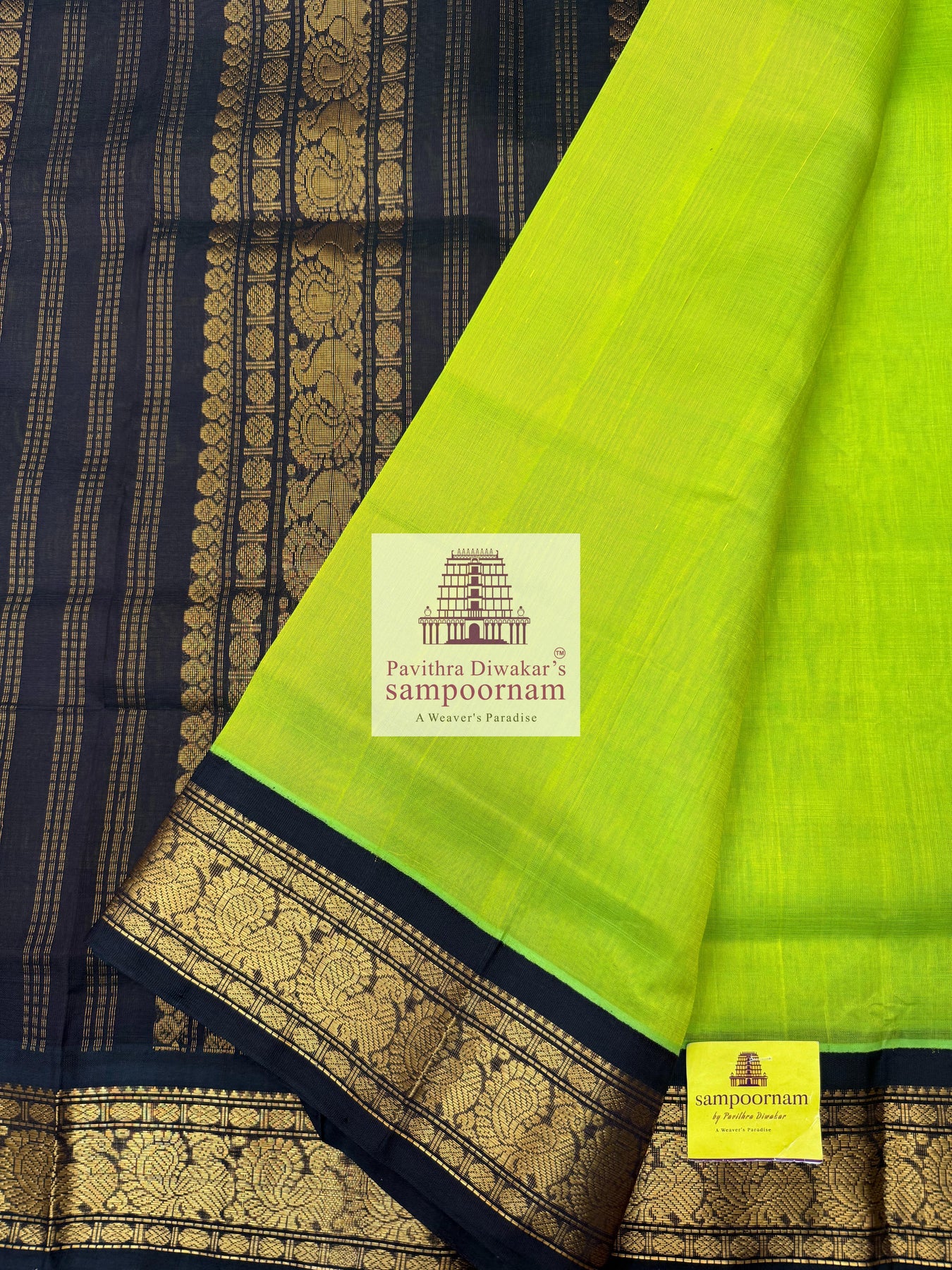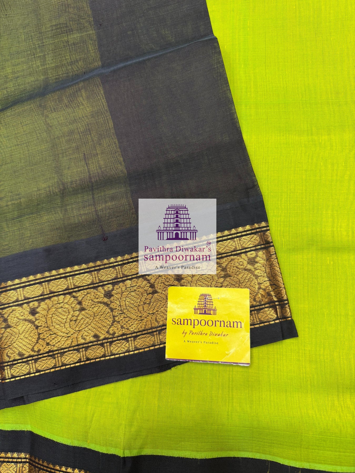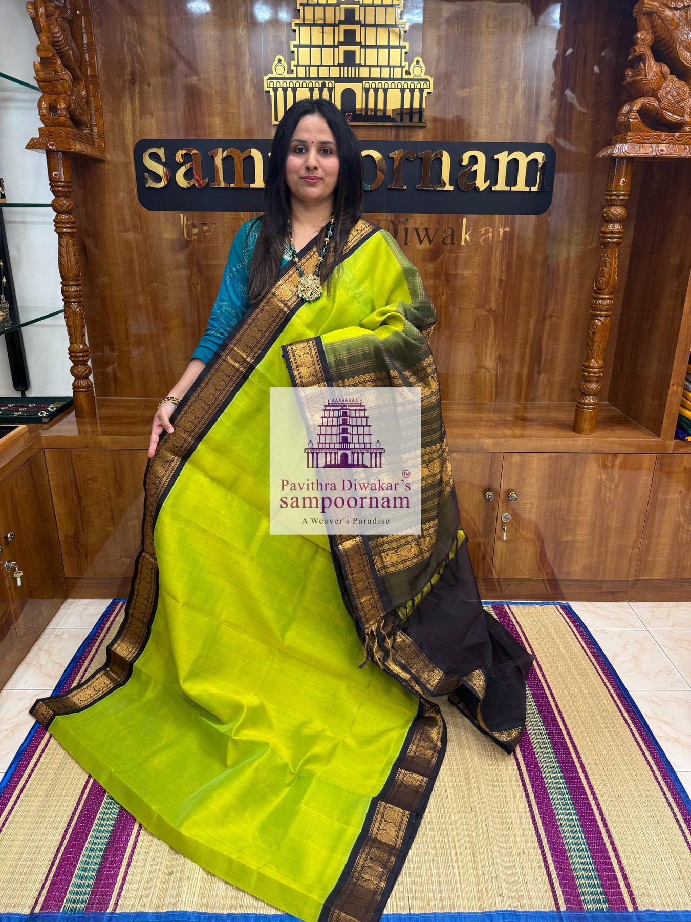 Parrot Green with Dark Brown , traditional borders and rich Pallu Korvai Silk Cotton Saree
