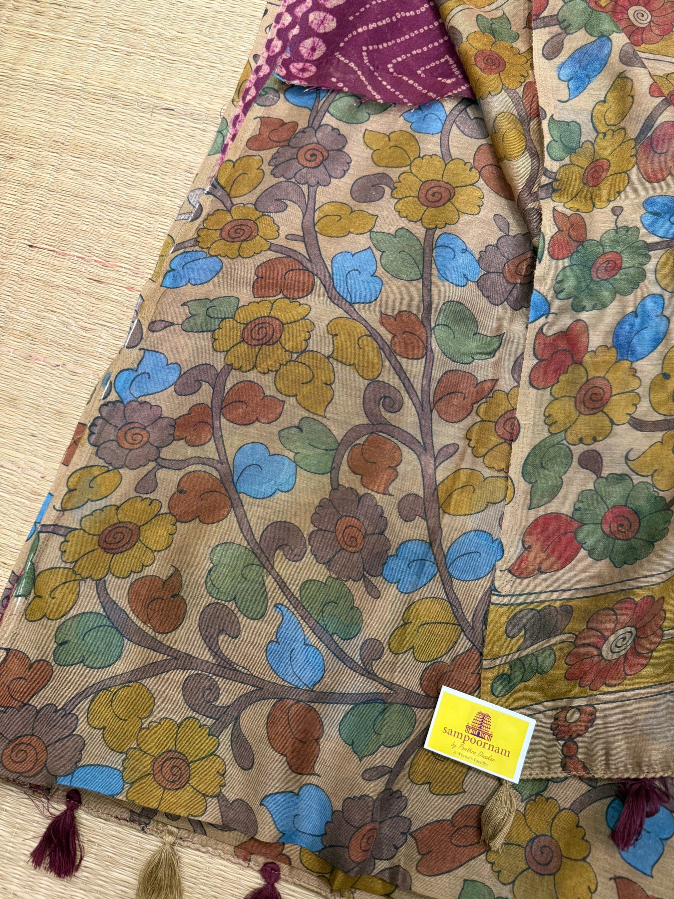 Magenta with Cream , Bandini print in the body , Kalamkari Pallu and Body Soft Cotton Saree