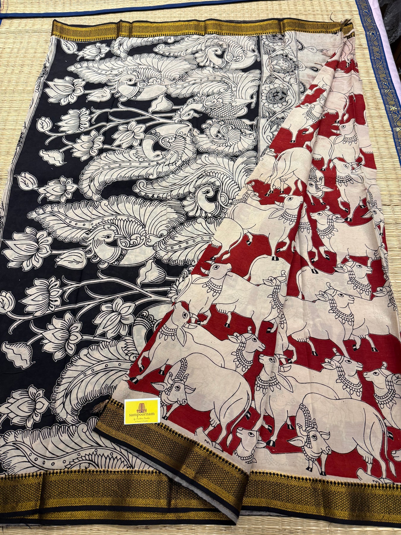 Red with Black , Kalamkari print in the body , Pallu and Blouse Semi Maheswari Silk Saree
