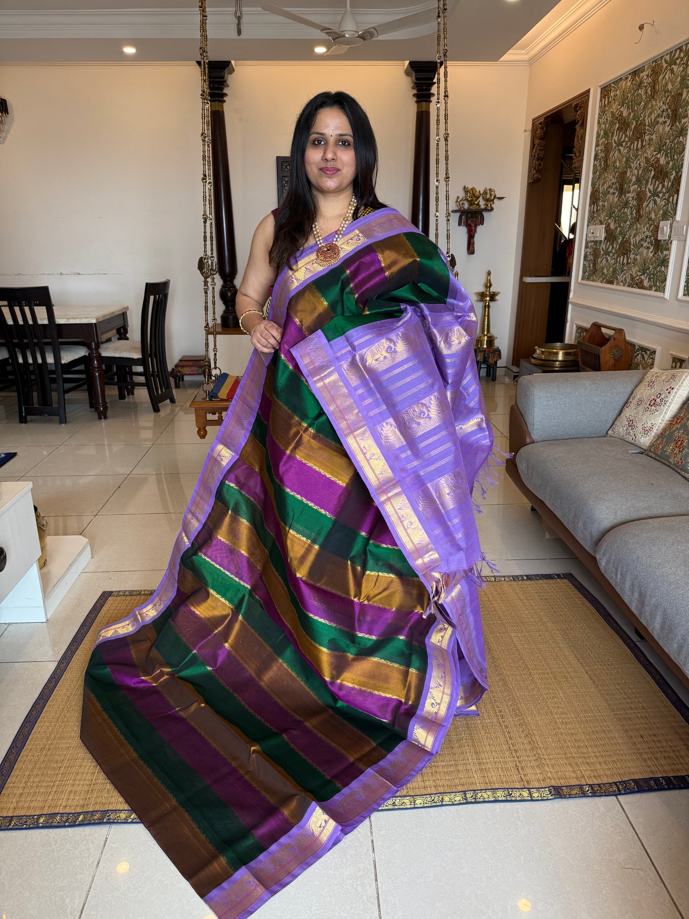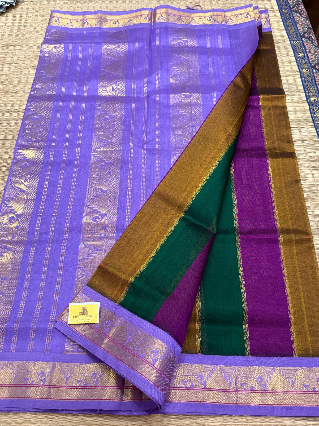 A Fusion of colours Green , Purple and Vendhayam with Lavender , traditional borders and rich Pallu Korvai Silk Cotton Saree