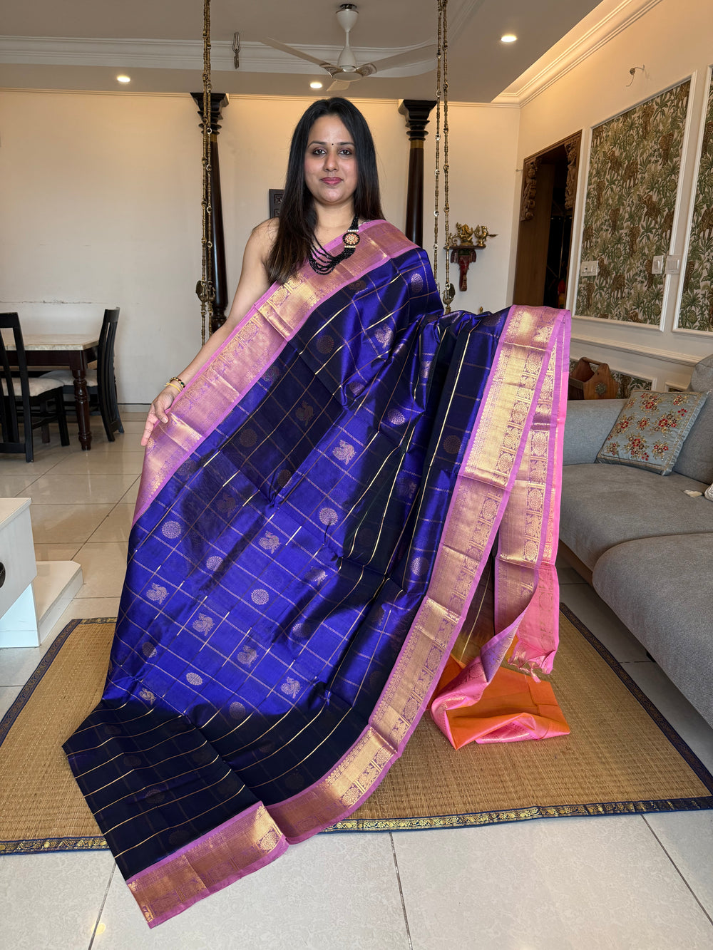Blue with Baby Pink , zari kattam in the body with Mayil and Chakram butta ,traditional borders and rich Pallu Silk Cotton Saree