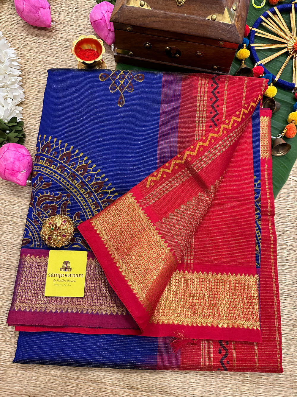 Blue with Red Vaira Oosi Kolam Handblock Printed Silk Cotton Saree