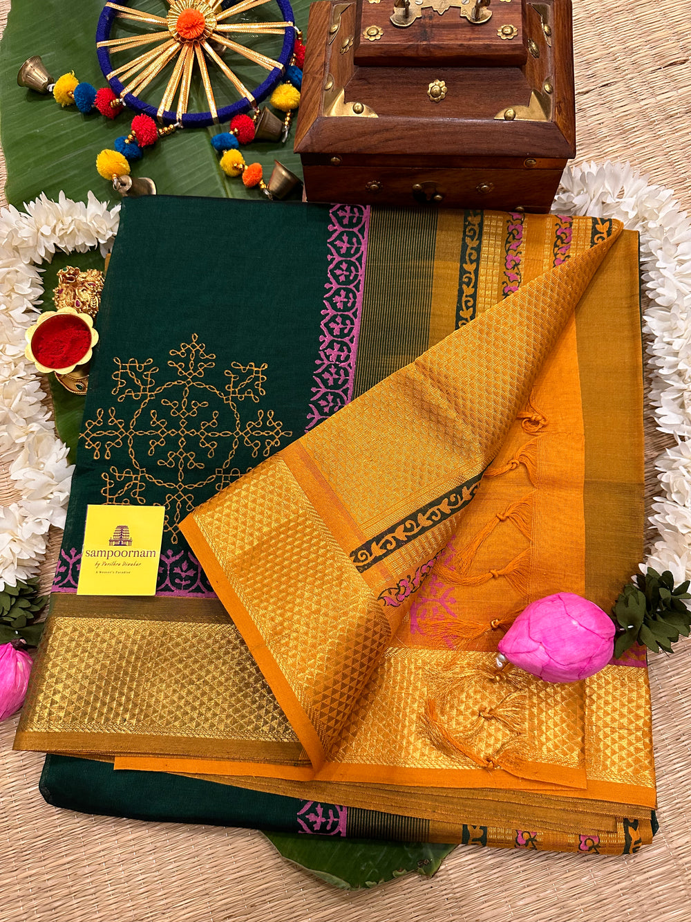 Green with Mustard Handblock Printed Silk Cotton Saree
