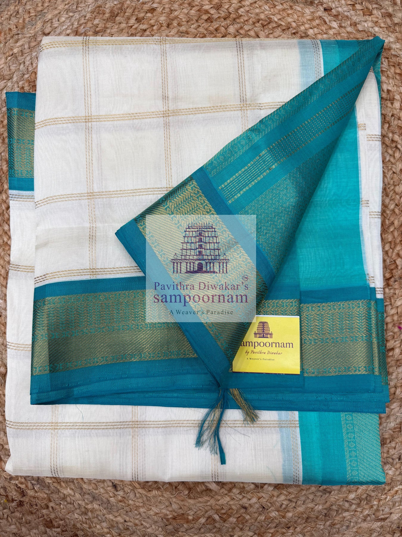Half White with Turquoise Blue , Zari checks in the body , traditional borders with richPallu Korvai Silk Cotton Saree