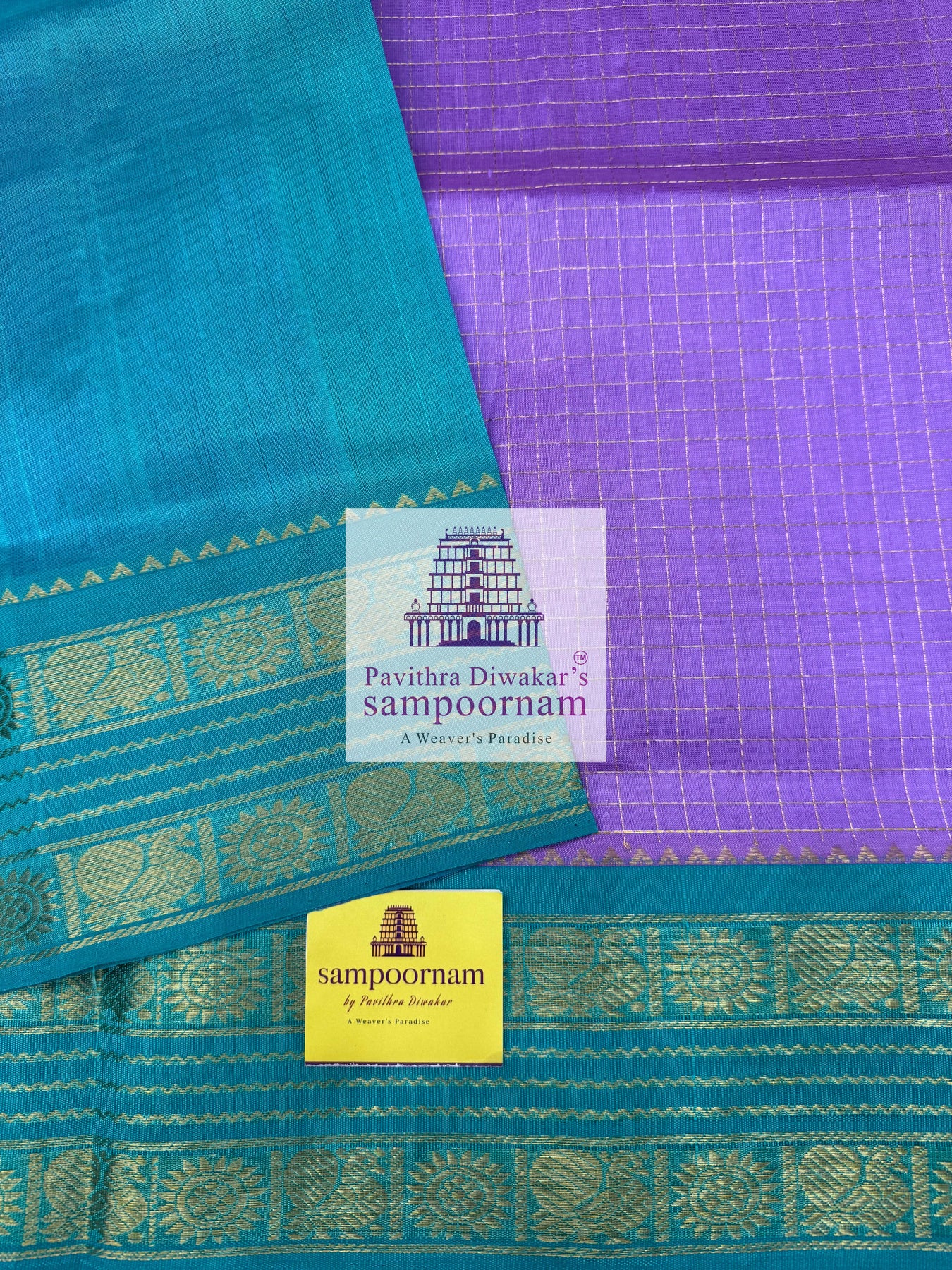 Lavender with Turquoise Blue, Rich Zari Checks in the Body, Rettapet Border and Grand Pallu Korvai Silk Cotton Saree