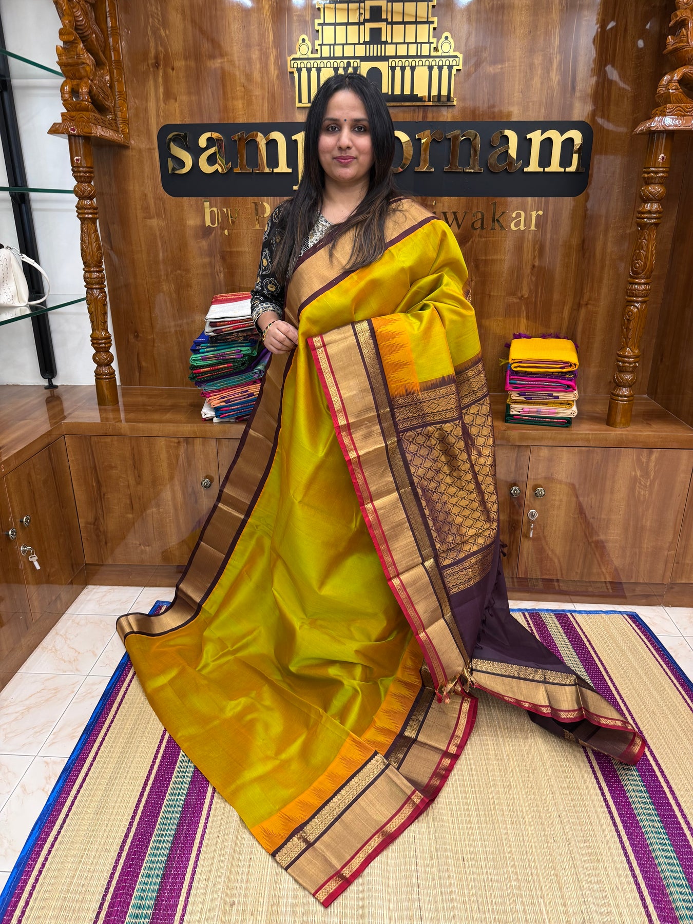 Manthulir Green with Brown, One Side Big Temple Border, Grand Pallu , Korvai Silk Cotton Saree