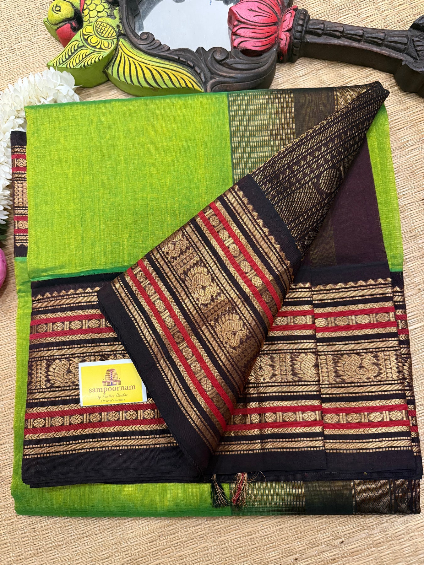 Parrot Green with Brown rich Kanchi border and grand Pallu Korvai Silk Cotton Saree