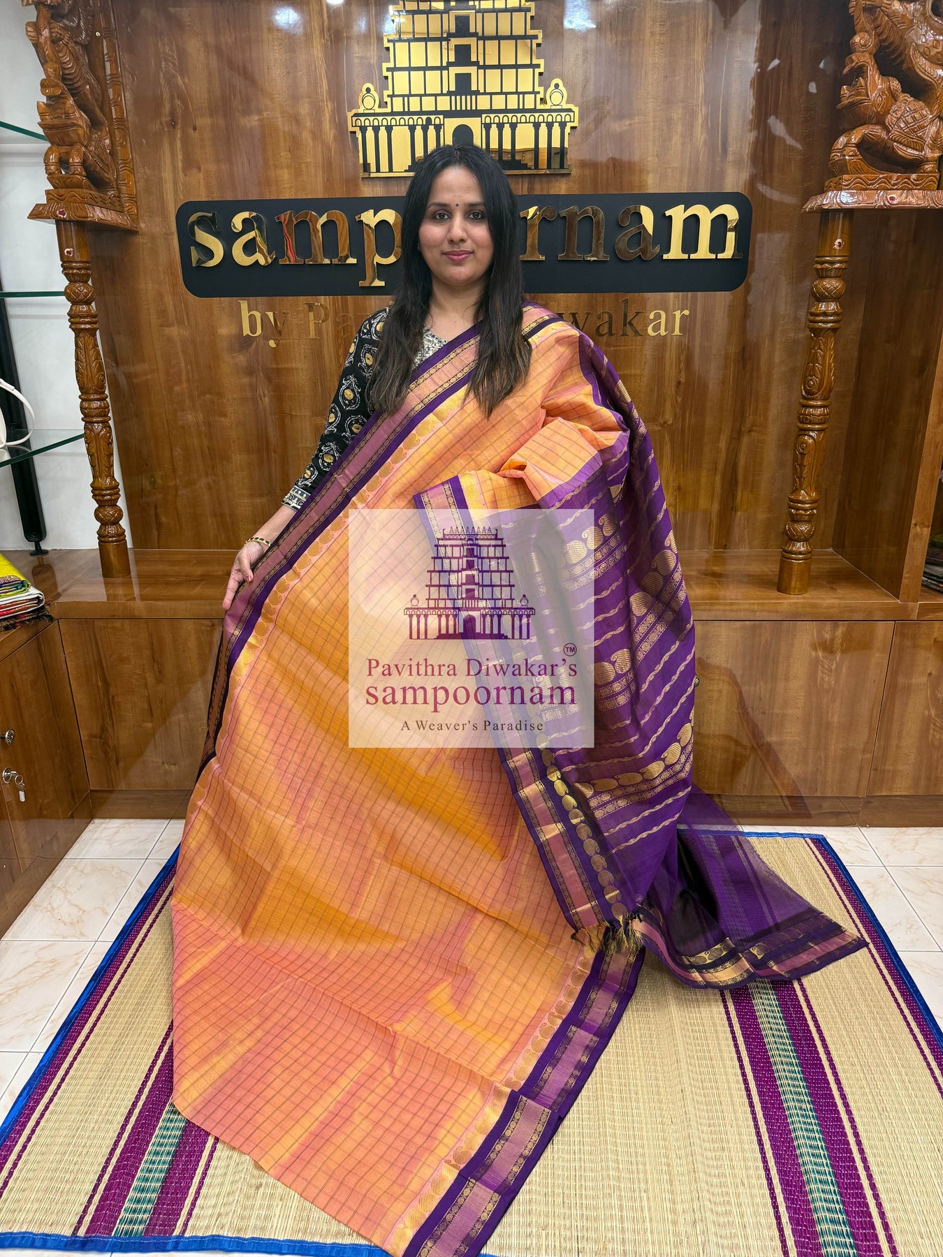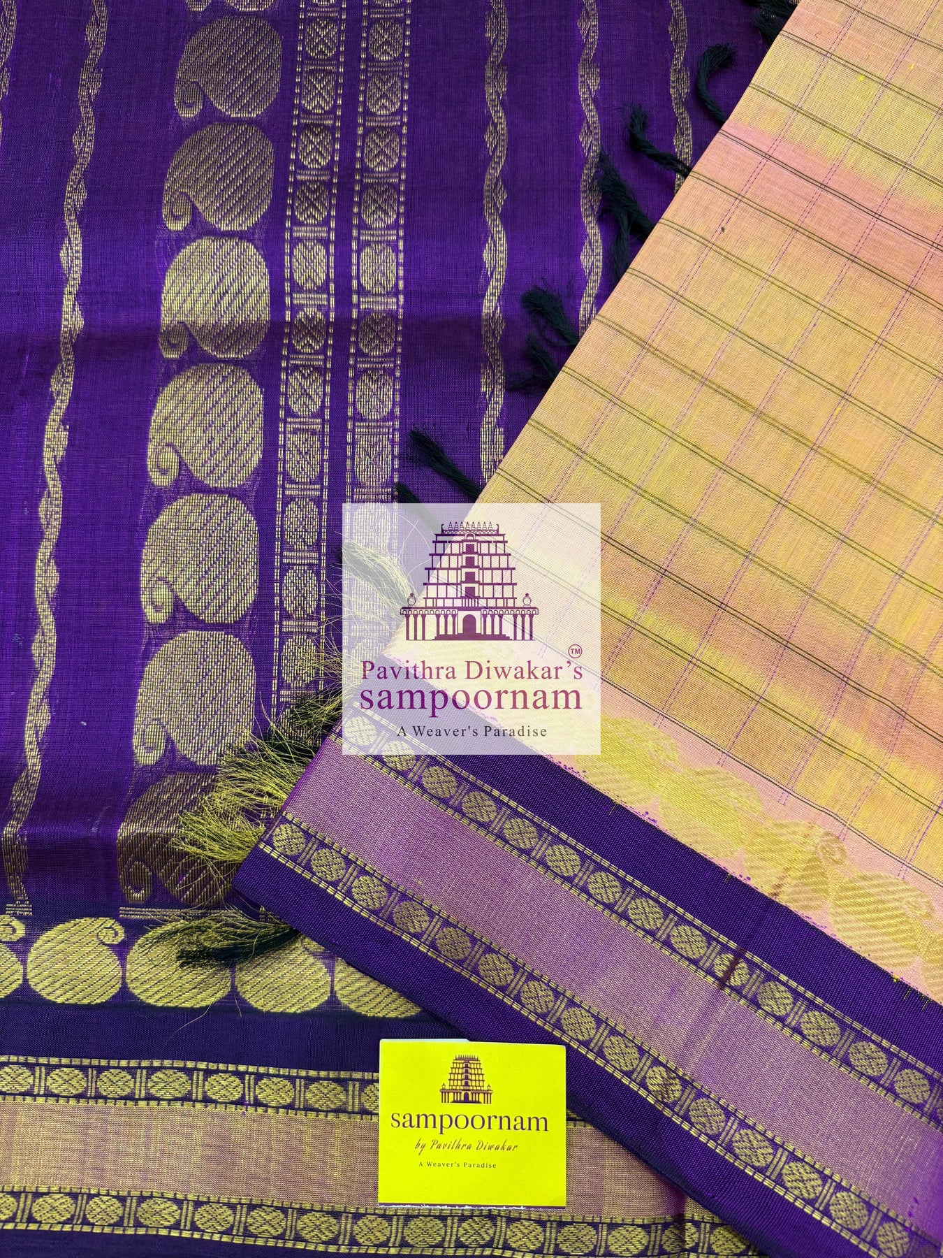 Peach Pink with Blue, Zari Checks in the Body, Rettapet Traditional Borders and Grand Pallu Korvai Silk Cotton Saree