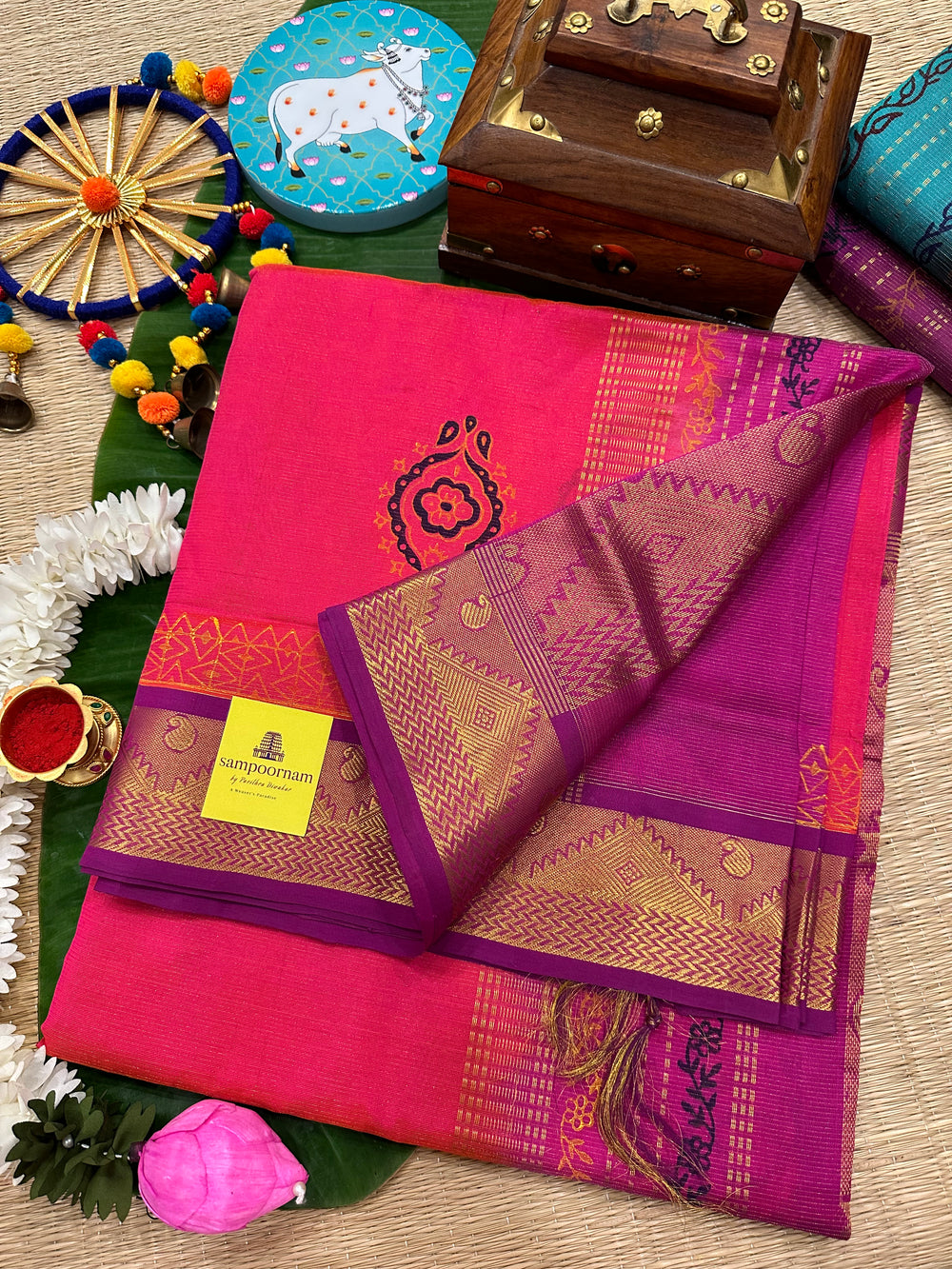 Pink with Puple Vairaoosi Handblock Printed Silk Cotton Saree