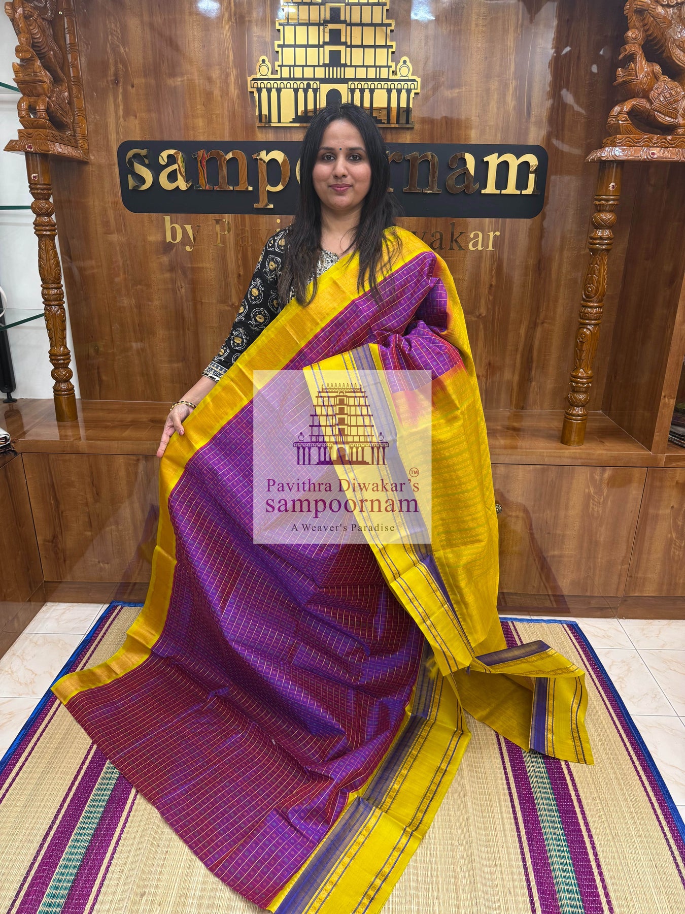 Purple with Lemon Yellow, Lakshadeepam Zari Butta in the Body, Rettapet Border and Grand Pallu ,Korvai Silk Cotton Saree