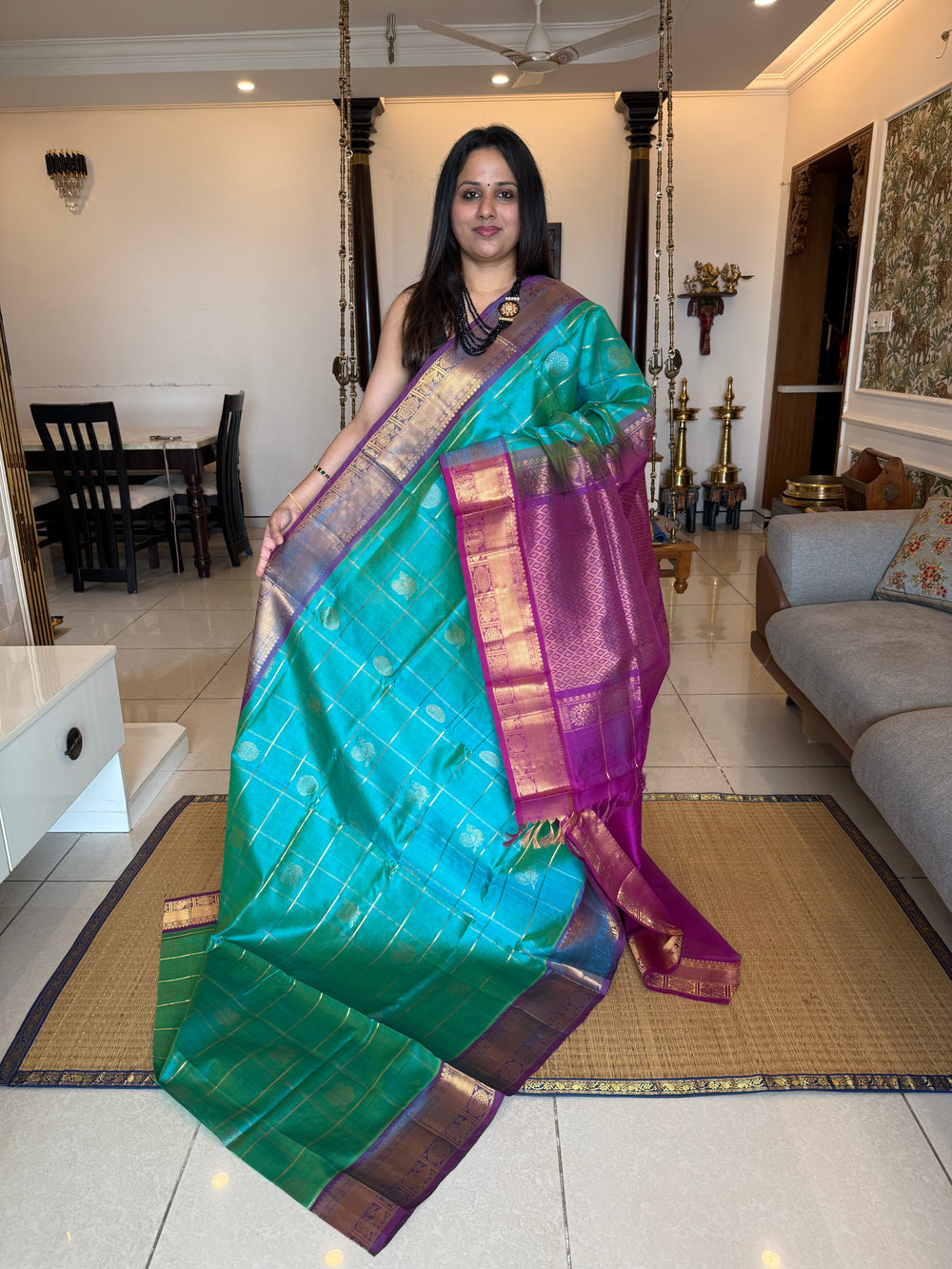 Ramar Blue with Purple , zari kattam in the body with Mayil and Chakram butta ,traditional borders and rich Pallu Silk Cotton Saree
