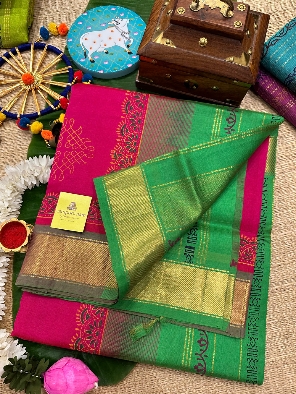 Reddish Pink With Green Kolam Handblock Printed Silk Cotton Saree