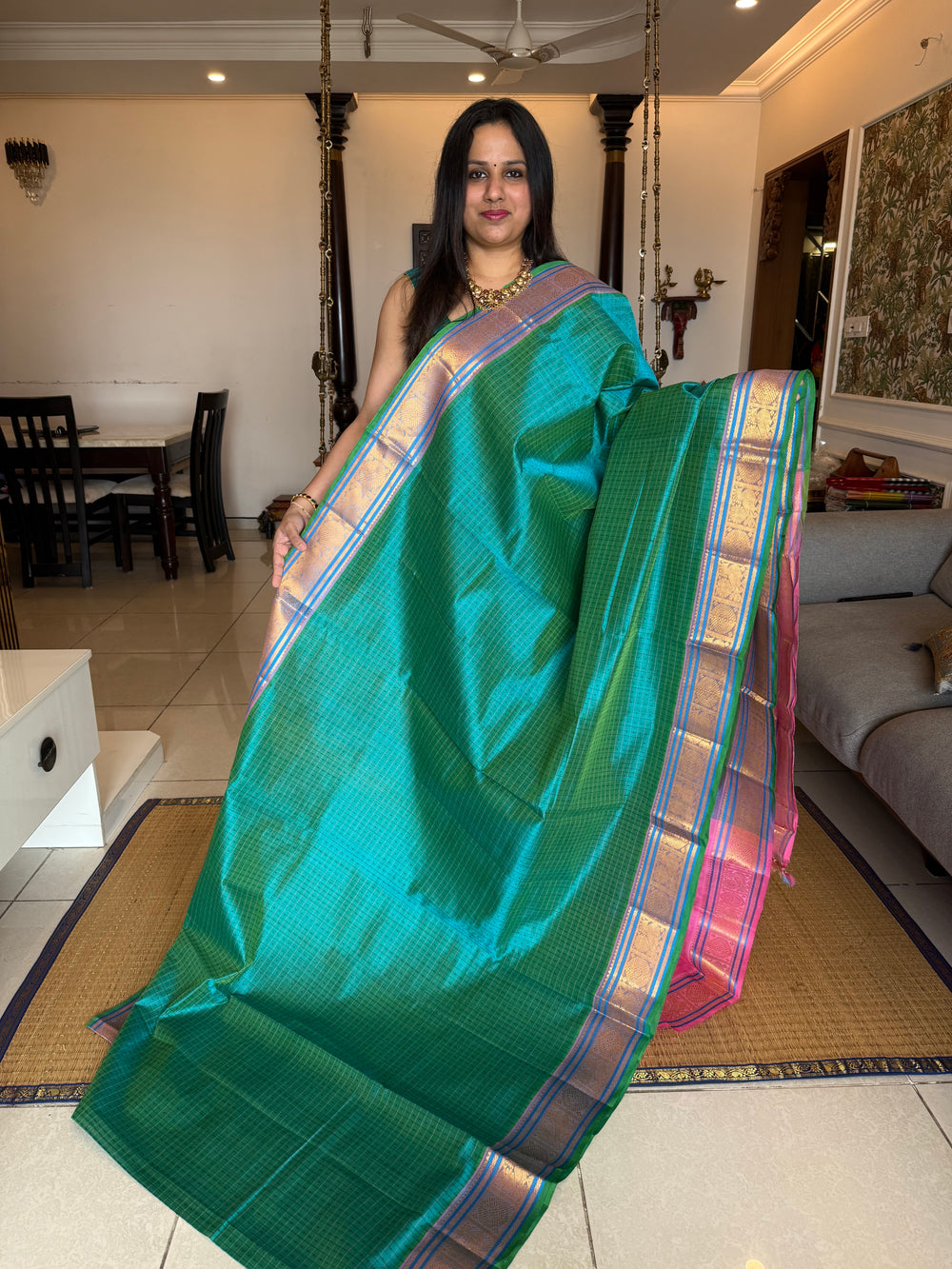 Turquoise Blue with Baby Pink , Lakshadeepam butta in the body , traditional borders and rich Pallu Lakshadeepam Silk Cotton Saree