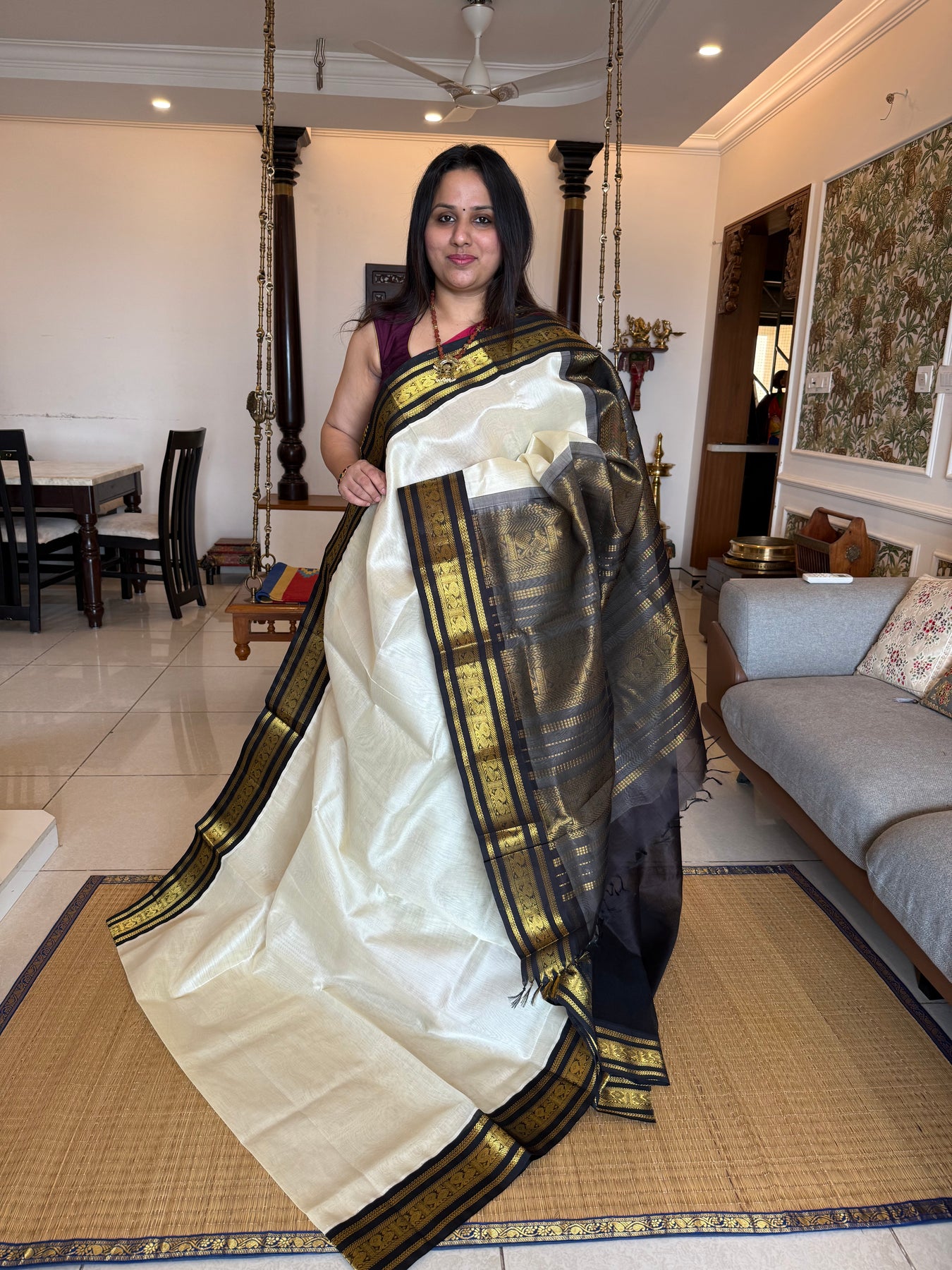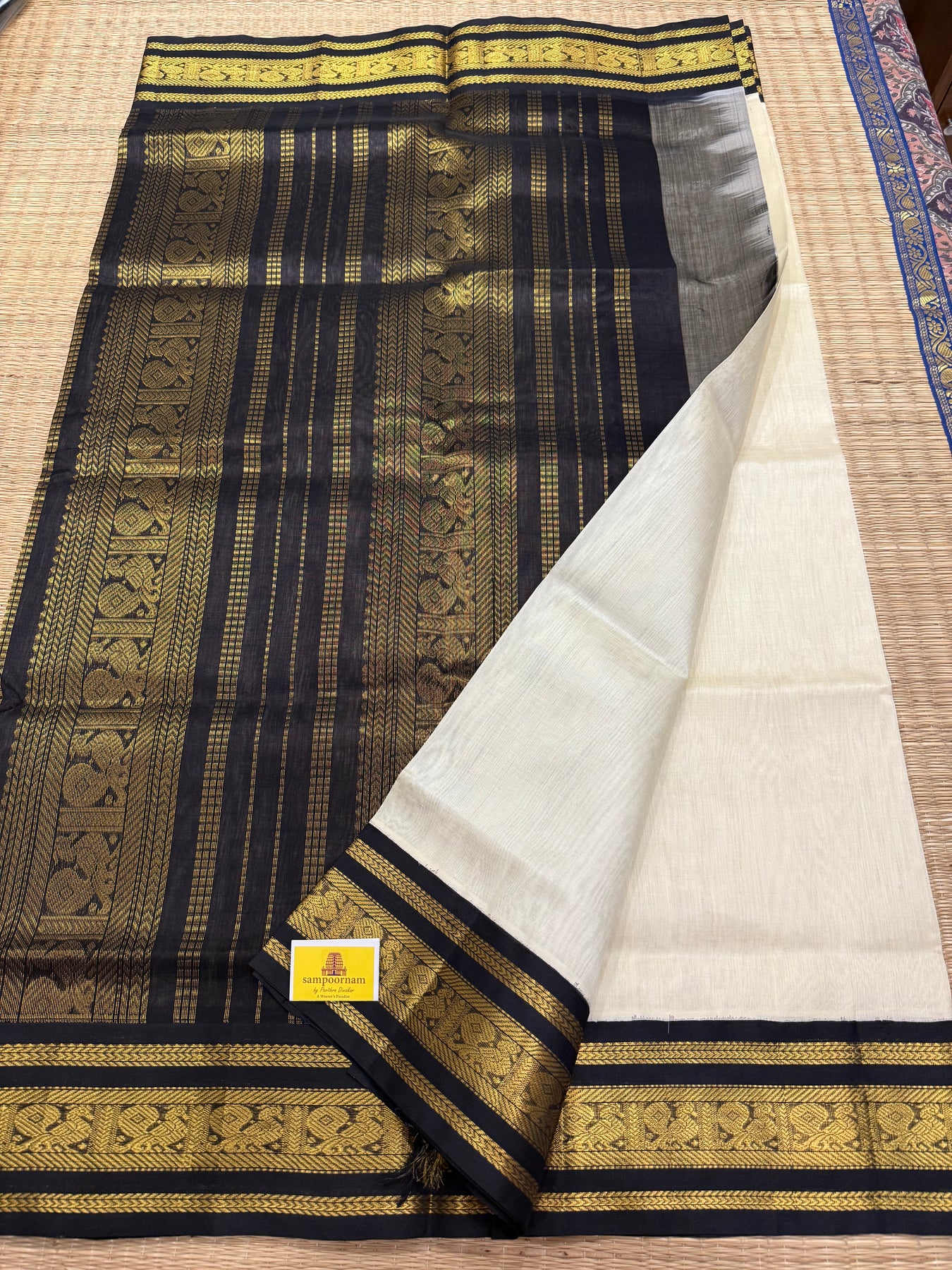 White with Black , traditional Kanchi borders and rich Pallu Korvai Silk Cotton Saree