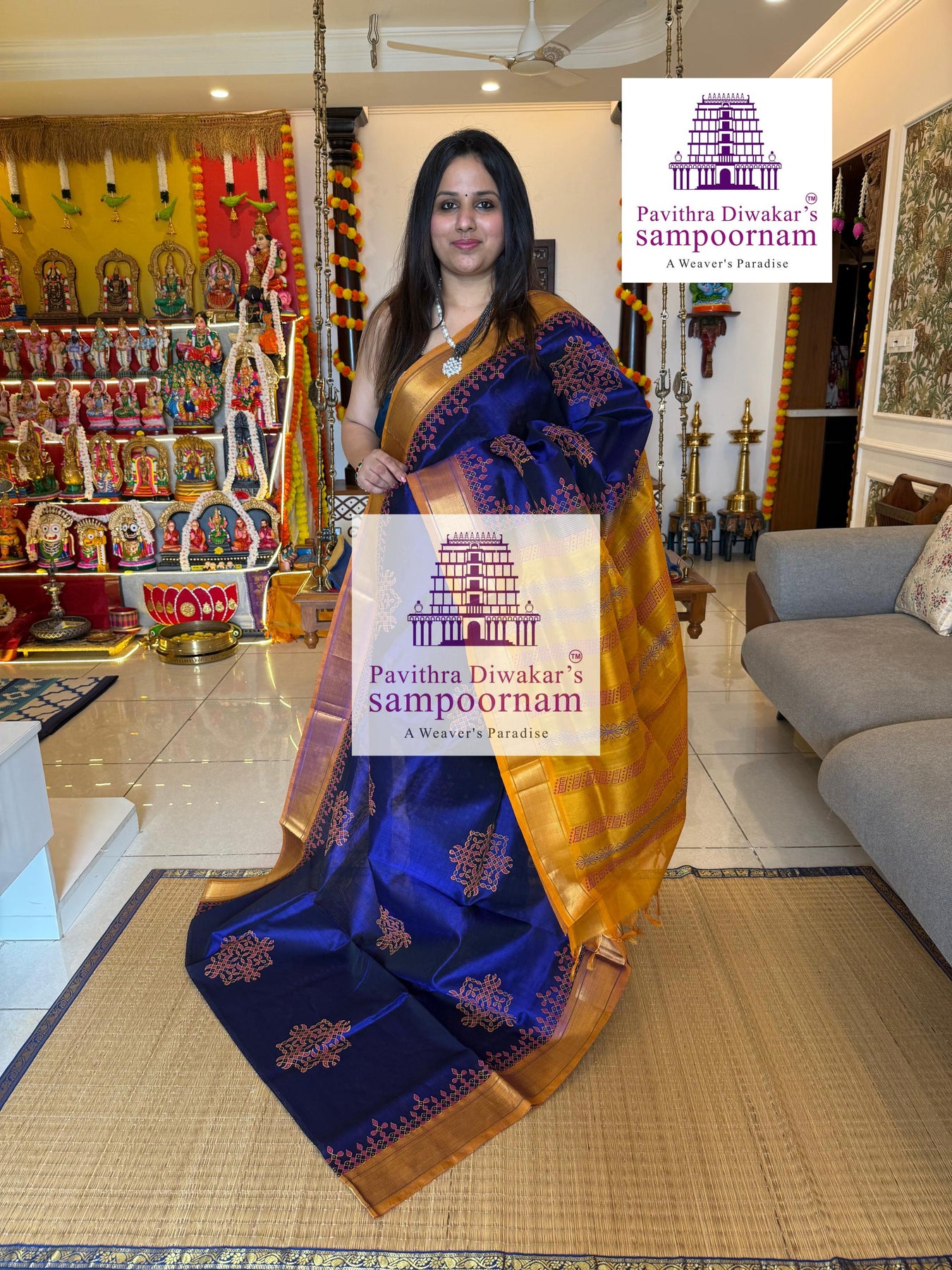 Blue with Mustard , traditional borders and rich Pallu Kolam Handblock Printed Silkcotton Saree