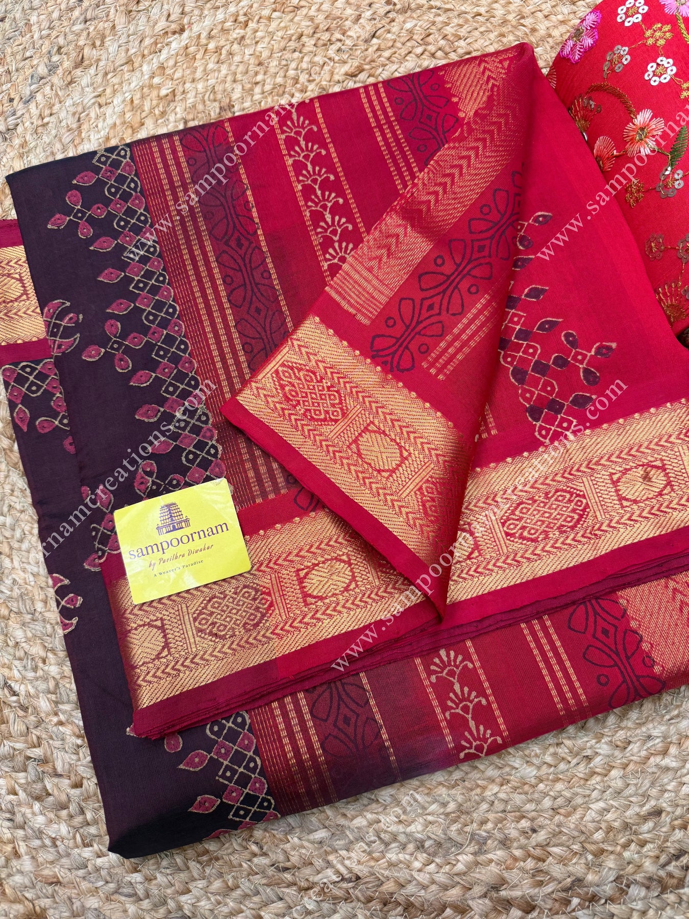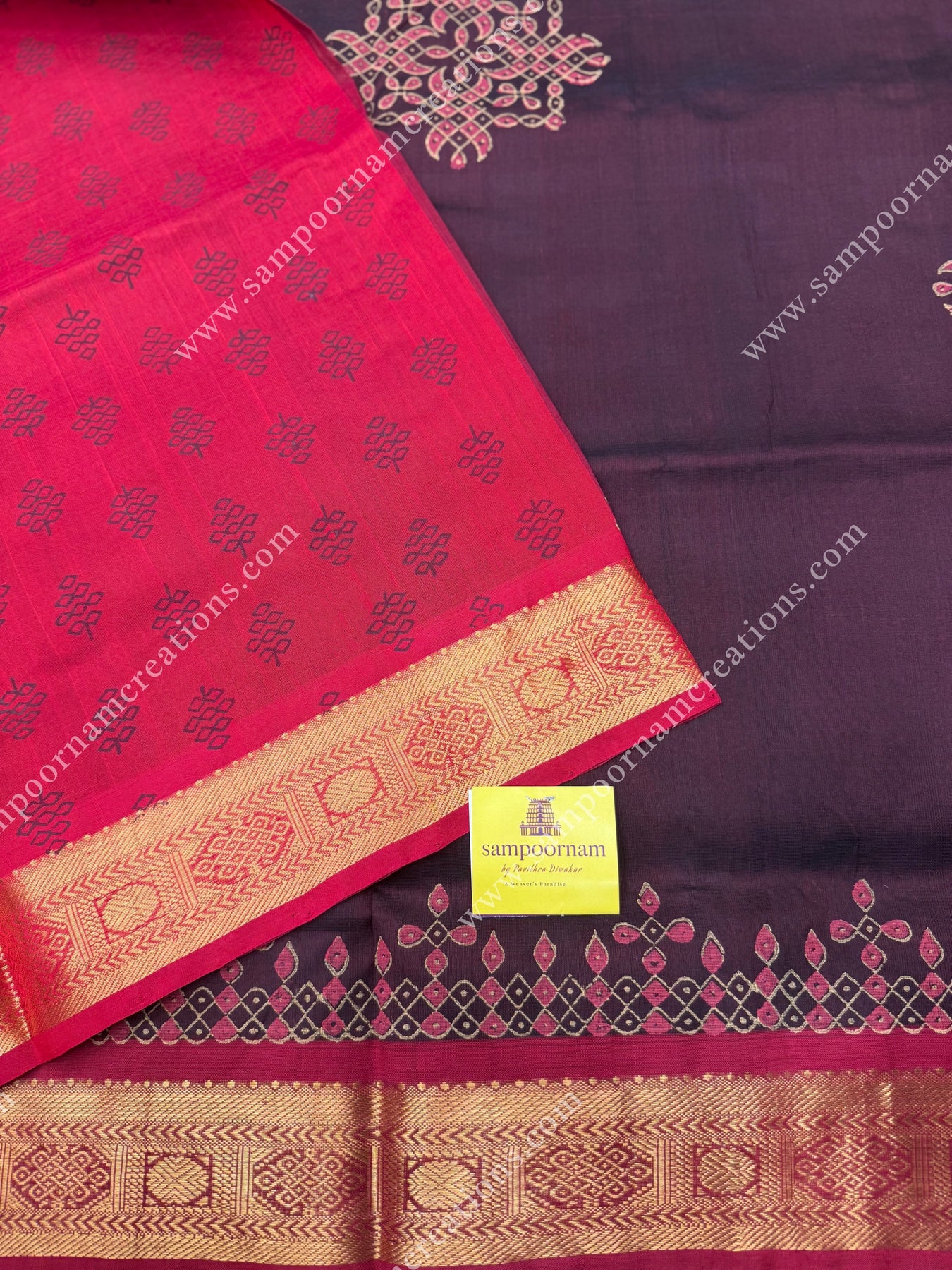 Brown with Red , Kolam Handblock Printed Silk Cotton Saree