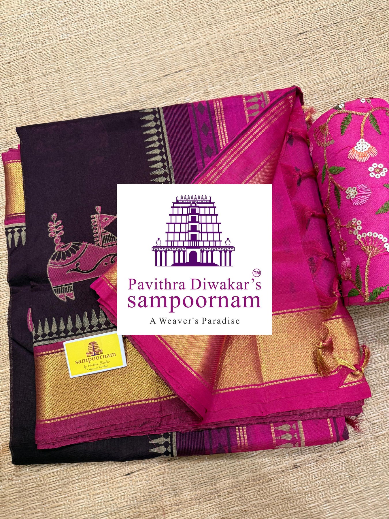 Dark Brown with Pink , traditional borders and rich Pallu , Terracota horse printed Silk Cotton Saree