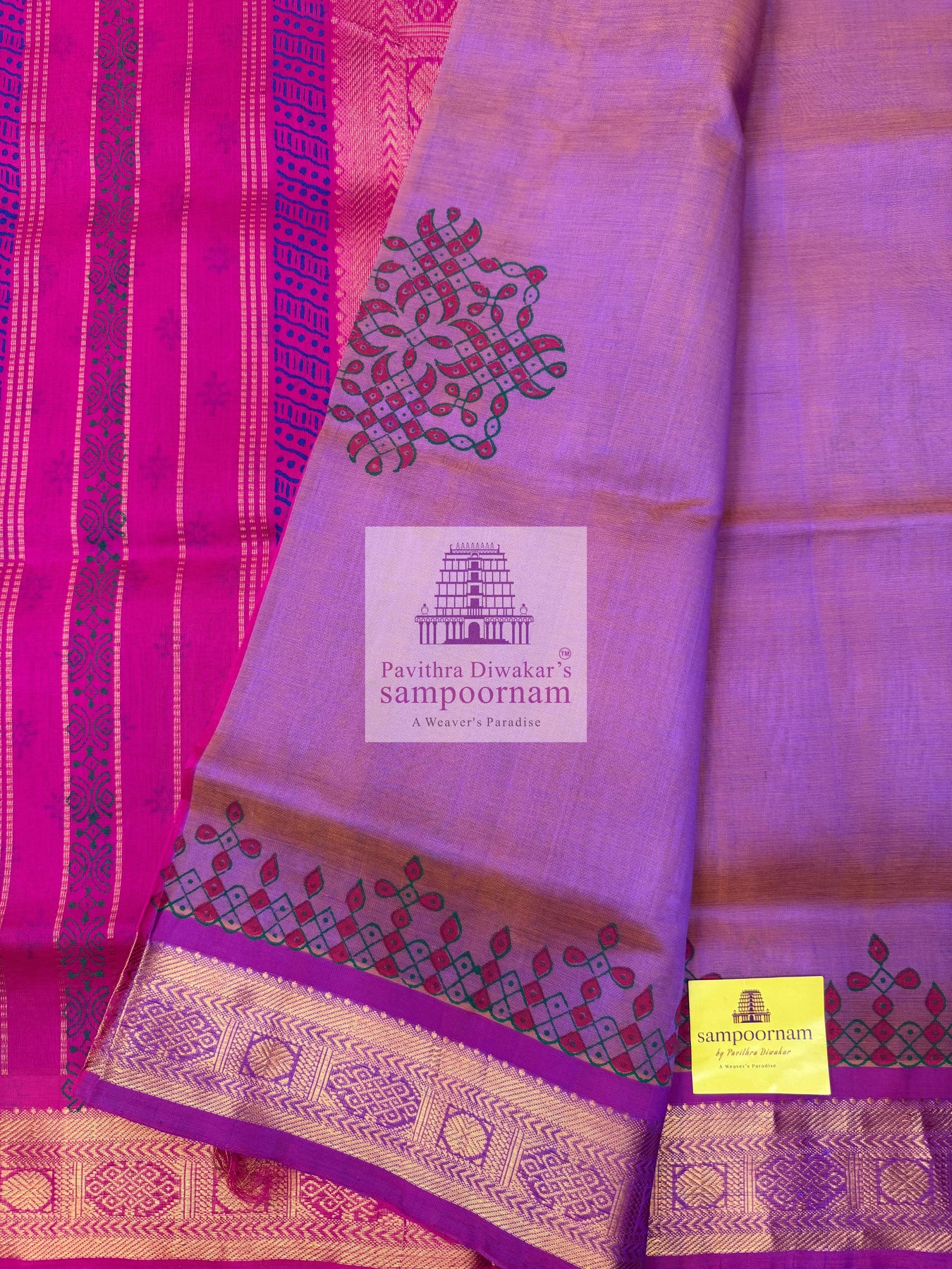 Double Shaded Lilac with Pink , Kolam Handblock printed Sillk Cotton Saree