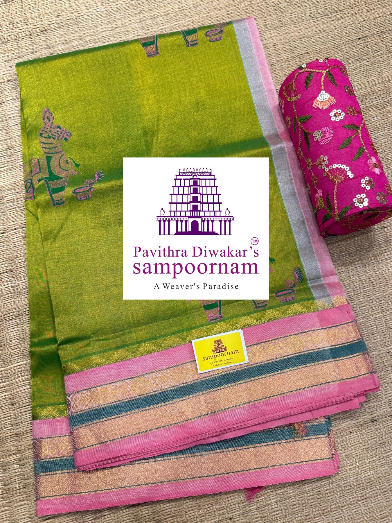 Light Leaf Green with Baby Pink , traditional borders , Terracota horse printed Silk Cotton Saree