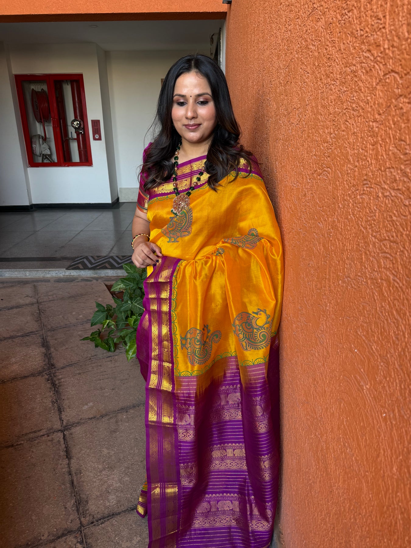 Mambazha Manjal with Purple, traditional elephant motif borders and rich Pallu, annam hand block prints in the body , korvai silk cotton saree