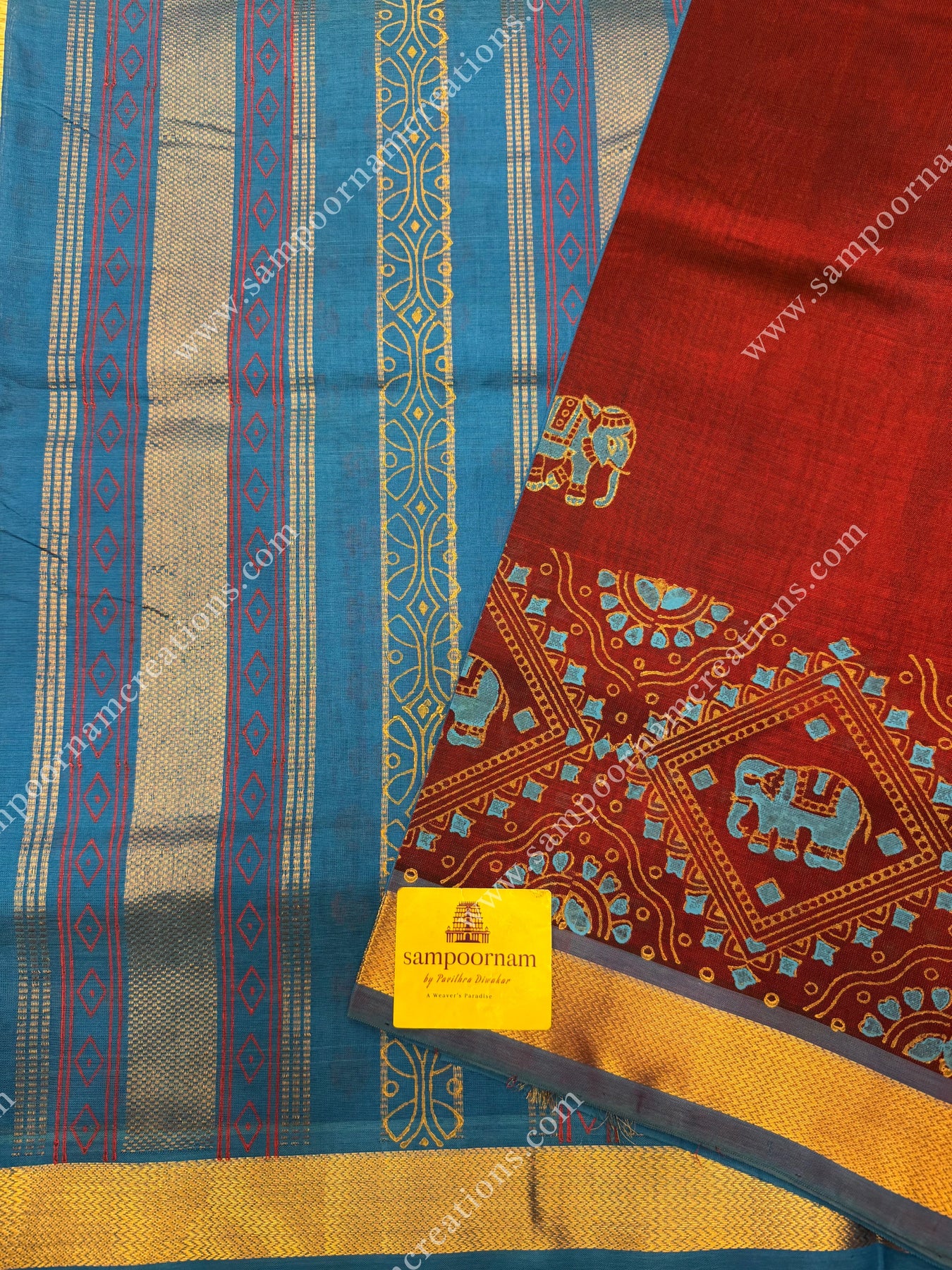 Maroon with Blue, Elephant border and Tiny Elephant in the body , Rich Pallu Handblock Printed Silk Cotton Saree